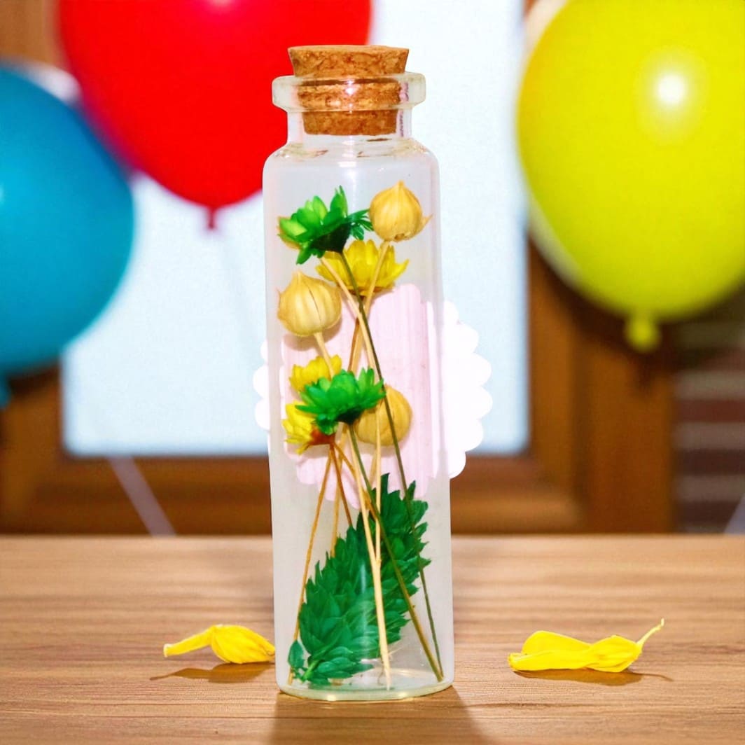 dintr-o sticluță delicată, umplută cu flori uscate naturale, atent alese pentru a transmite puritate și iubire.