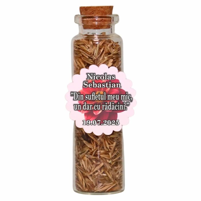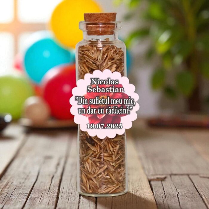 mărturie botez semințe de flori în sticluță cu dop de plută