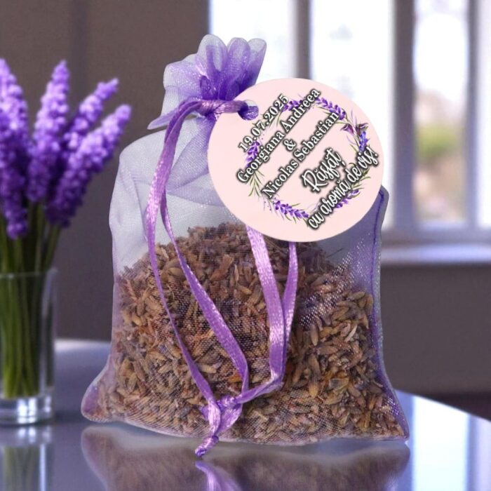 Saculețul este realizat din organza mov – o alegere inspirată care evocă delicatețea florilor de lavandă. Este legat cu o fundiță satinată, iar eticheta rotundă, personalizată cu numele mirilor și data evenimentului, transmite un mesaj cald. Întregul ansamblu este gândit pentru a oferi o impresie de naturalețe și rafinament, completând decorul unei nunți boho, rustice sau romantice.