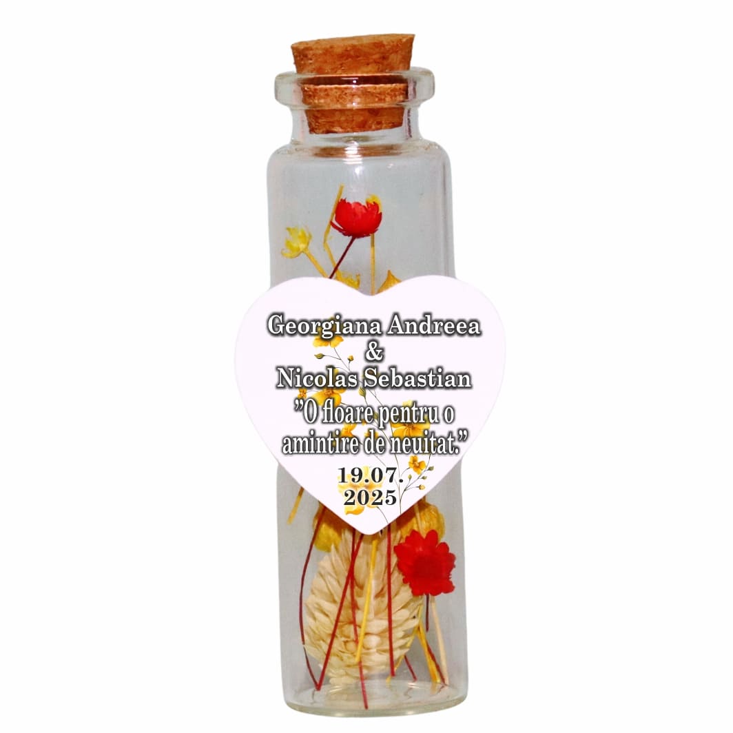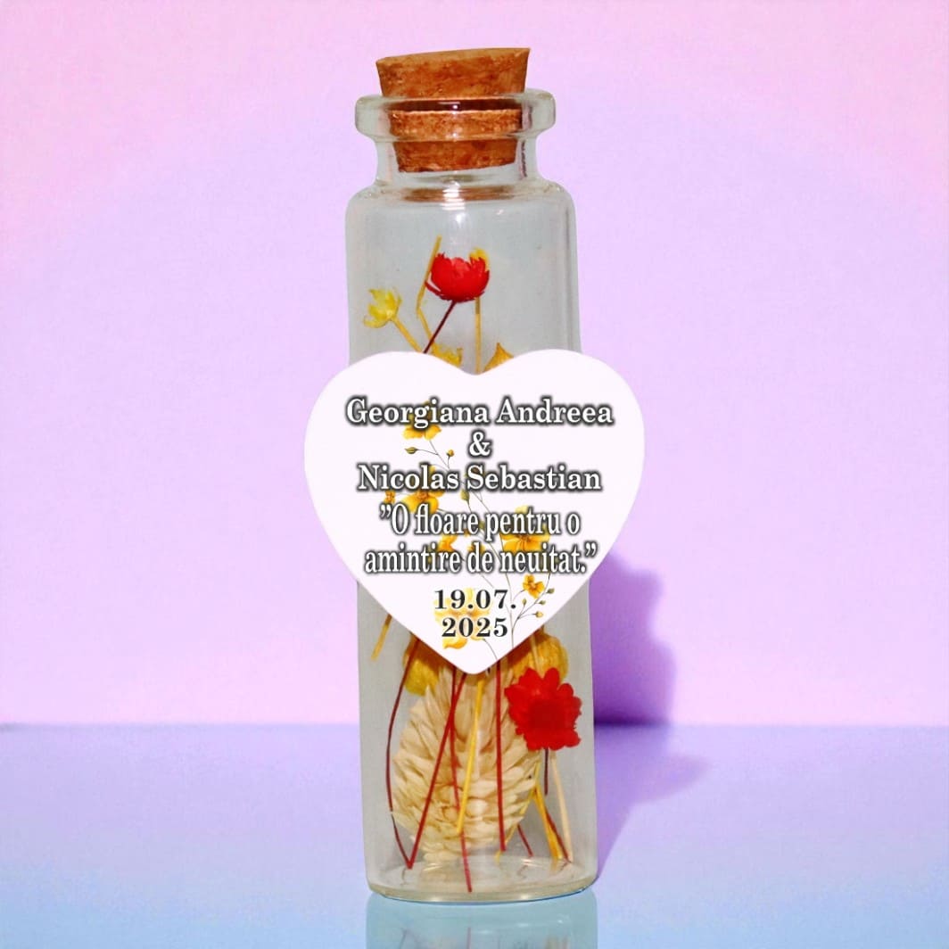 Mărturiile sunt realizate manual, cu grijă pentru fiecare detaliu, astfel încât fiecare buchet de flori uscate să păstreze farmecul naturii în forma sa cea mai pură. În interiorul sticluței se regăsesc flori viu colorate, atent selecționate și aranjate pentru a reda armonia și echilibrul unei iubiri sincere.