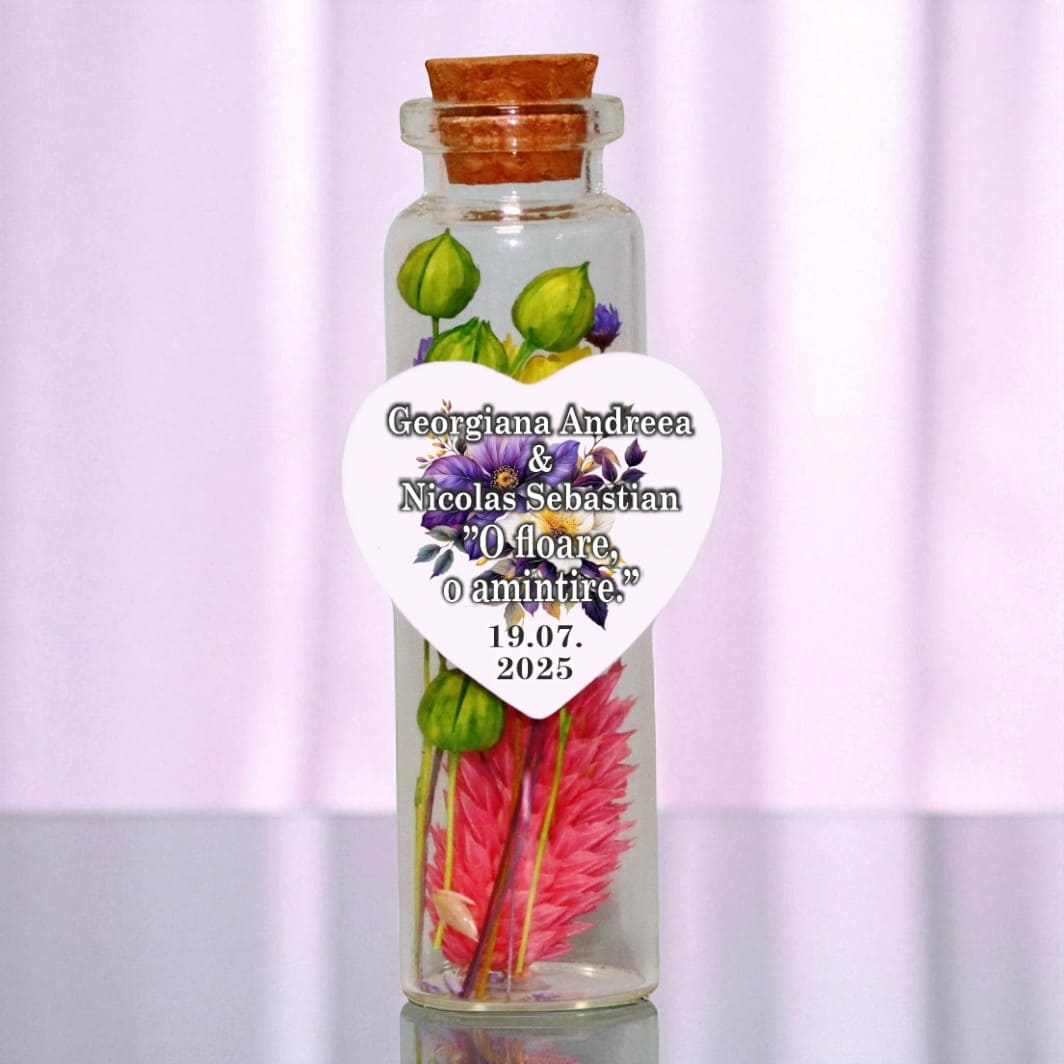 Mărturiile sunt realizate manual, cu grijă pentru fiecare detaliu, astfel încât fiecare buchet de flori uscate să păstreze farmecul naturii în forma sa cea mai pură. În interiorul sticluței se regăsesc flori viu colorate, atent selecționate și aranjate pentru a reda armonia și echilibrul unei iubiri sincere.