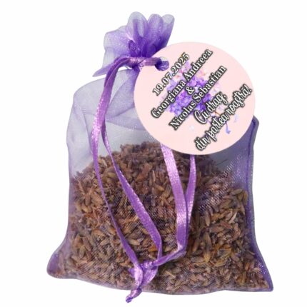 Folosim doar lavandă uscată natural, provenită din culturi atent îngrijite. Florile sunt recoltate și uscate în condiții optime, pentru a-și păstra parfumul autentic și culoarea naturală. Ne asigurăm că fiecare saculeț este umplut cu grijă, astfel încât invitații să se bucure de un produs de calitate, realizat cu drag și atenție la detalii.