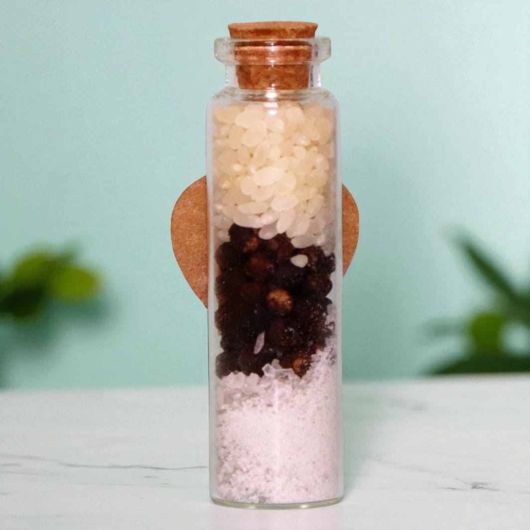 Sticla transparenta, sigilata cu un dop de plută naturală, este umpluta stratificat cu ingrediente simple, dar încărcate de semnificație: orez, piper și sare.