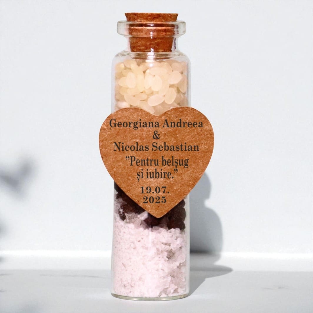 Alege să oferi invitaților tăi un cadou care spune o poveste și care rămâne în sufletele lor mult timp după încheierea nunții. Sticluta cu sare, piper și orez, personalizata cu numele mirilor și data evenimentului, este alegerea ideală pentru cei care apreciază detaliile și valoarea simbolică a fiecărui element.