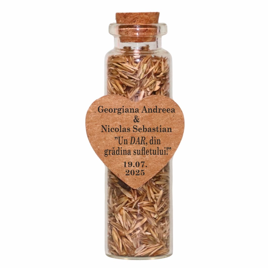 Surprinde-ți invitații cu o mărturie de nuntă originală și plină de semnificație: o sticluta eleganta, umpluta cu semințe de flori, care spune o poveste despre iubire, creștere și amintiri durabile. Această mărturie de nuntă cu semințe de flori este o invitație simbolică de a planta momente frumoase și de a cultiva legături sincere, chiar și după ce petrecerea s-a încheiat.