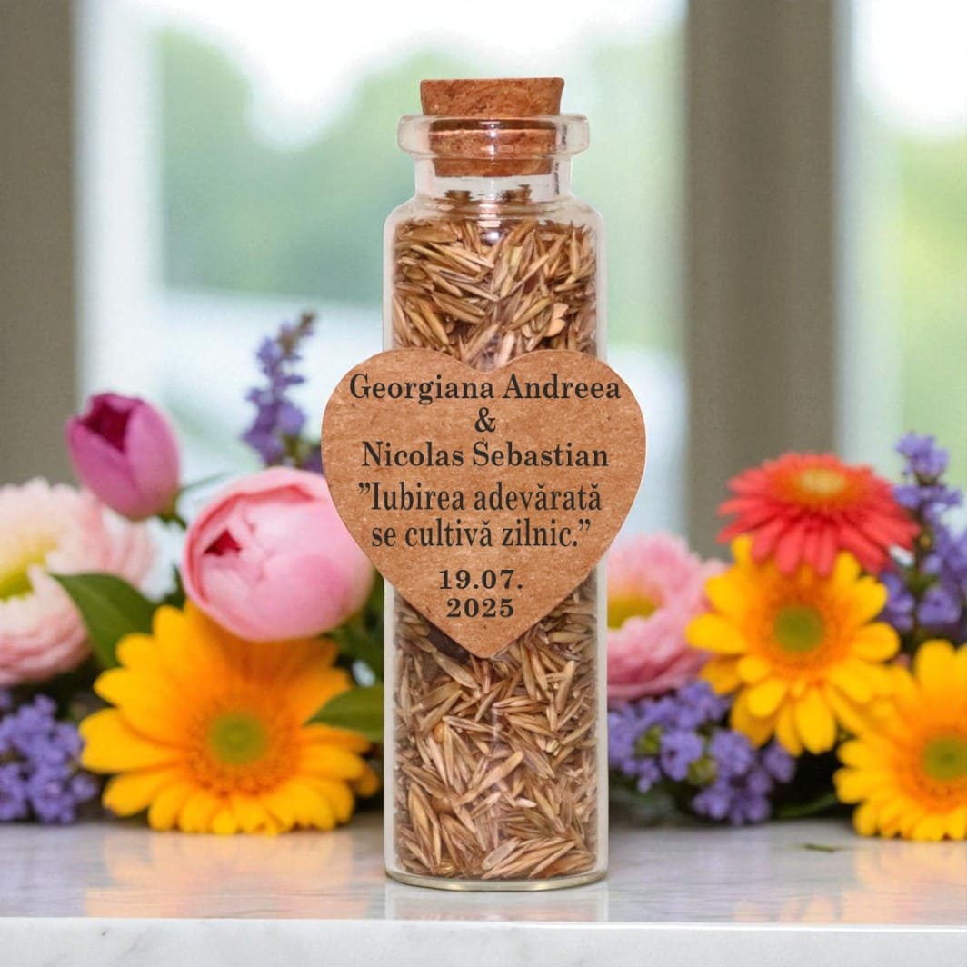 Surprinde-ți invitații cu o mărturie de nuntă originală și plină de semnificație: o sticluta eleganta, umpluta cu semințe de flori, care spune o poveste despre iubire, creștere și amintiri durabile. Această mărturie de nuntă cu semințe de flori este o invitație simbolică de a planta momente frumoase și de a cultiva legături sincere, chiar și după ce petrecerea s-a încheiat.