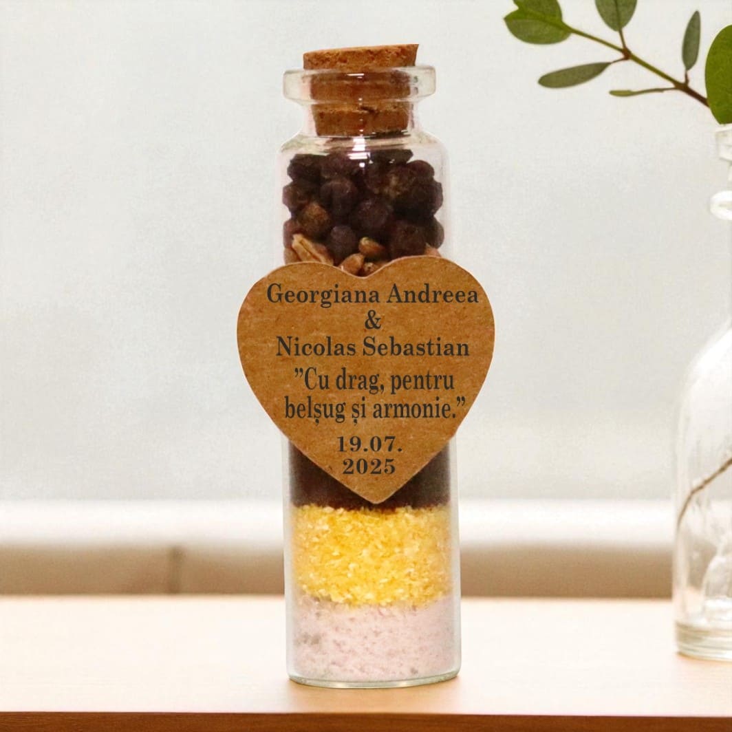 Această mărturie de nuntă cu sporul casei este nu doar un cadou decorativ rafinat, ci și o binecuvântare tradițională oferită cu suflet invitaților, pentru a le transmite dragoste, apreciere și urări de bine. Fiecare strat din sticla poartă o energie aparte, iar alăturarea lor este un mesaj profund despre unitate, echilibru și comuniune.