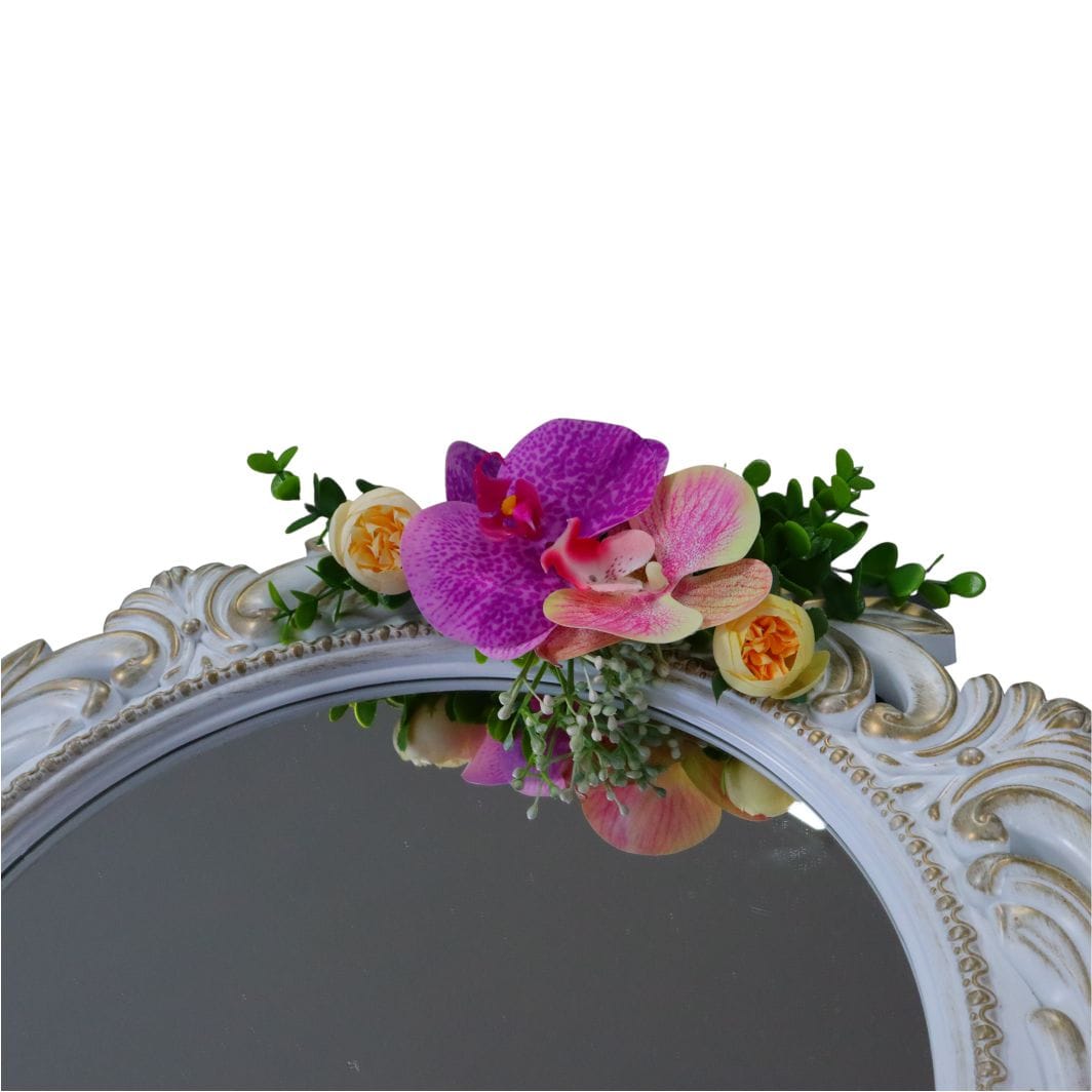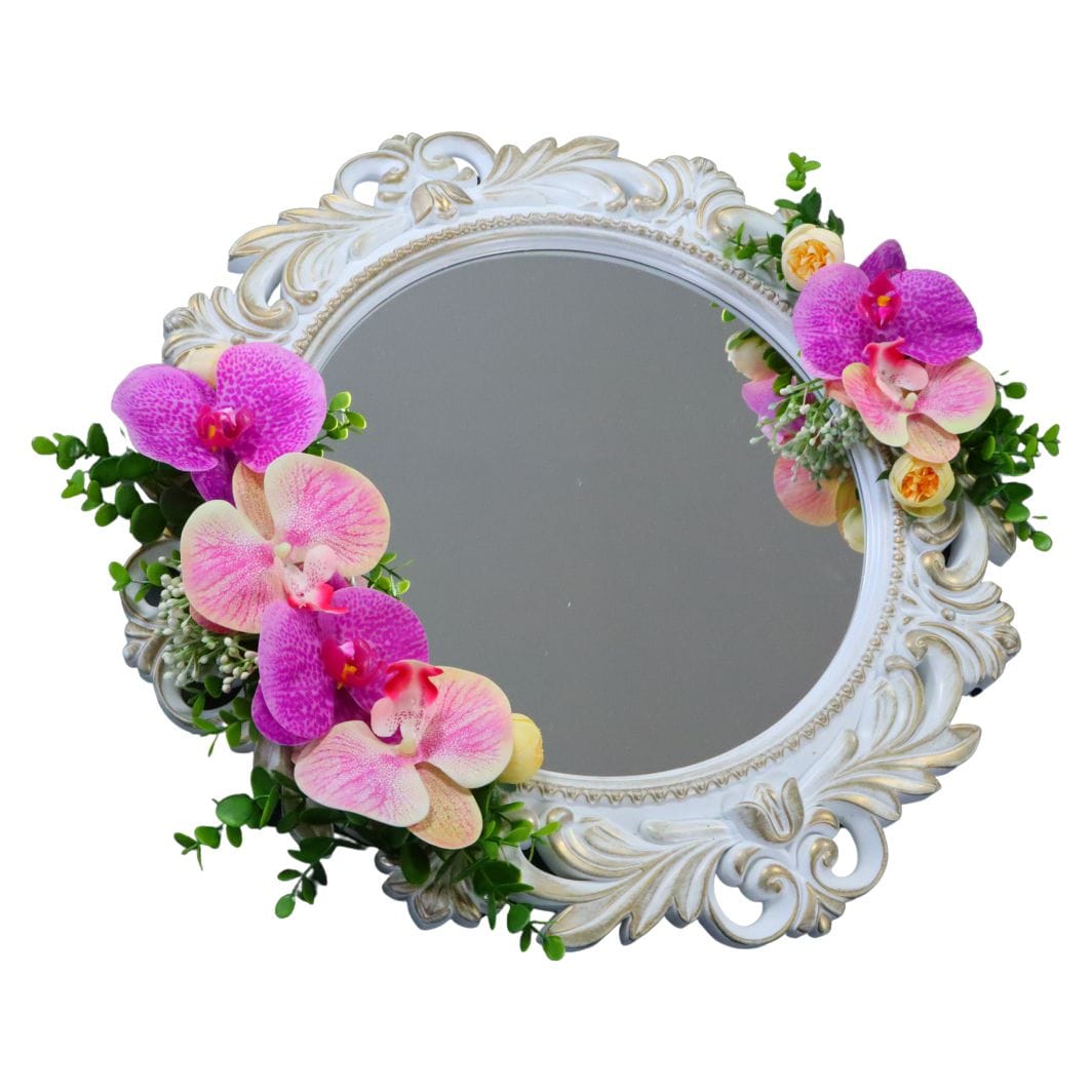Oglinda Miresei Decorata, Orhidee, Bujori, Roz, Mov, Crem, 47 cm, OGLDC018