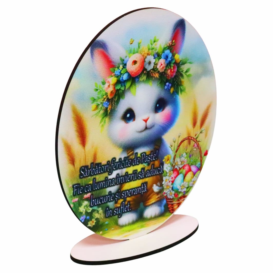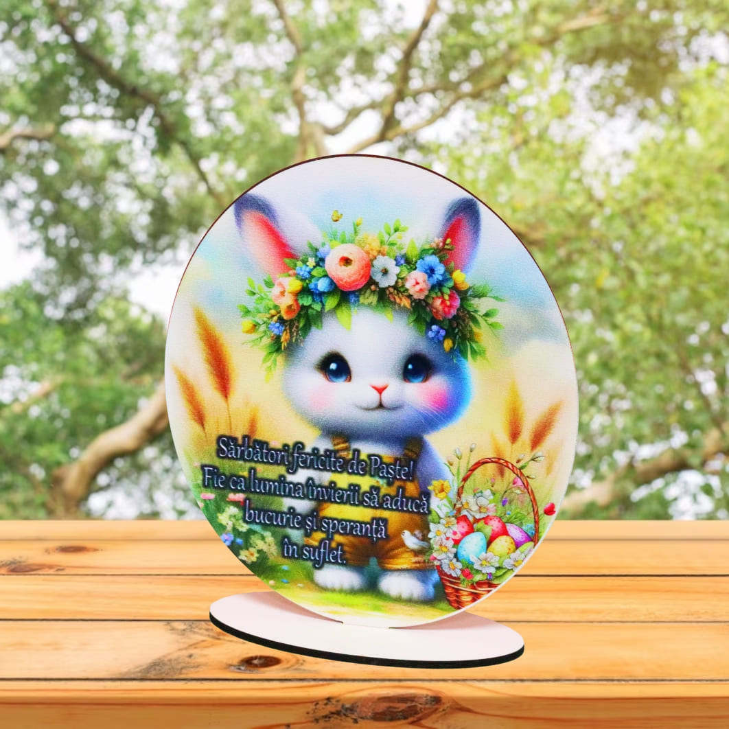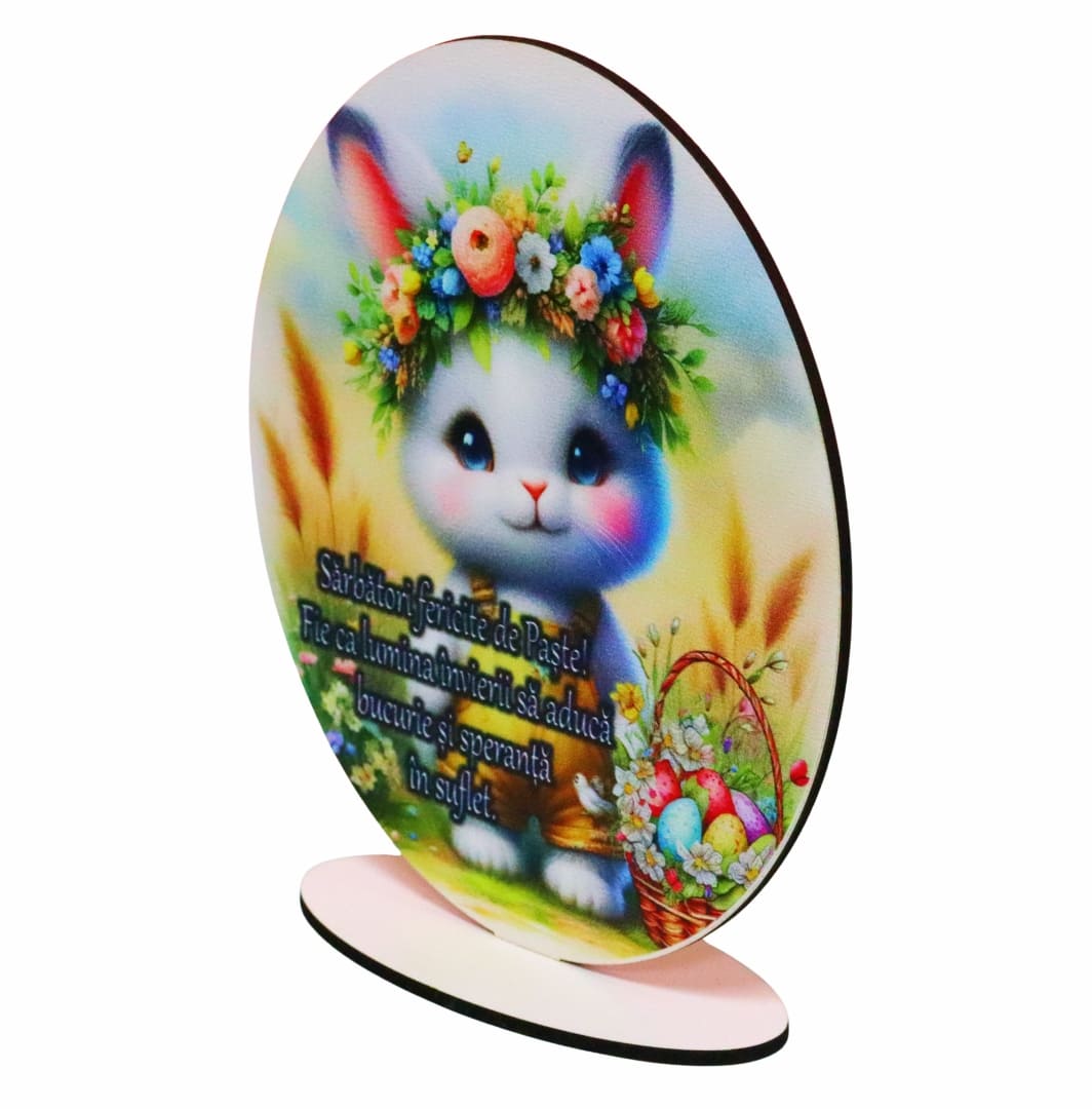 Acest ornament paste lemn, cu dimensiunile de 15 × 12,5 cm, se evidențiază printr-un design vesel și cald, având ca element central un iepuraș adorabil, decorat cu o coroniță florală în nuanțe pastelate. Fundalul luminos, împodobit cu elemente specifice primăverii, precum spicele aurii și coșul cu ouă colorate, completează perfect acest decor, transformându-l într-un simbol al renașterii și optimismului.