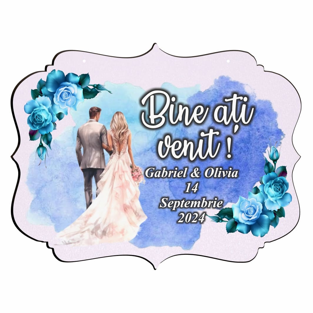 Pancarta Bine Ati Venit, Personalizata, Nunta, Albastru, 40x31cm, PBUV028