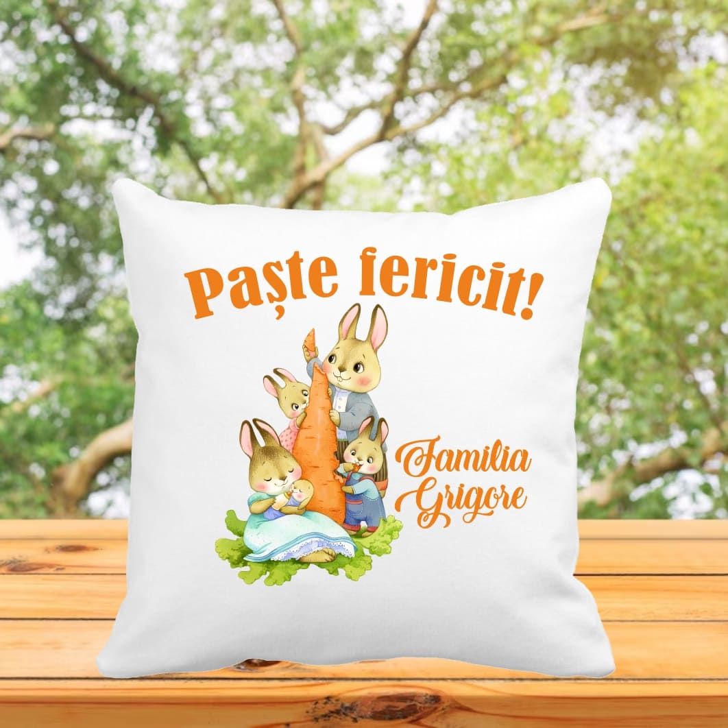 Această perna Paste personalizata este un cadou deosebit, creat pentru a aduce bucurie, culoare și emoție în perioada sărbătorilor pascale. Designul vesel prezintă o familie de trei iepurași adorabili, așezați într-o compoziție armonioasă. Mesajul „Paște fericit!” și posibilitatea de personalizare cu numele familiei transformă această pernă într-un obiect decorativ unic, cu valoare sentimentală.