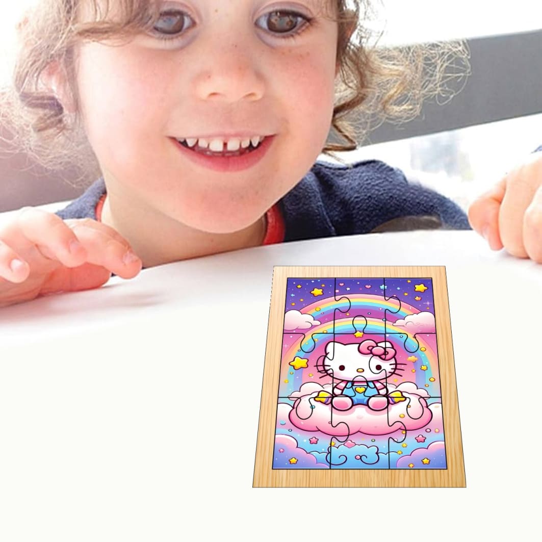 Puzzle din lemn, Hello Kitty, 9 piese, Multicolor, 15×12 cm, PDUV062