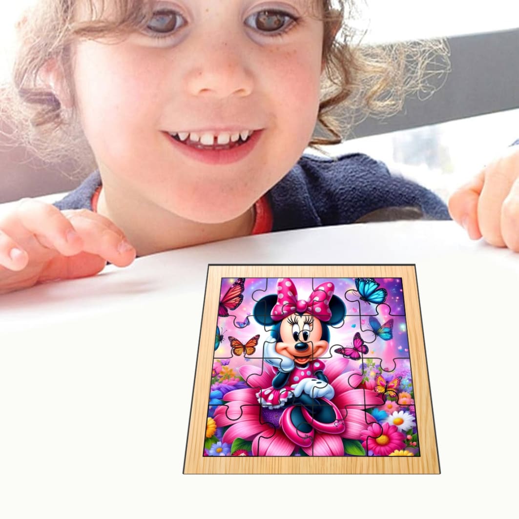 Puzzle din lemn, Minnie Mouse, 16 piese, Multicolor, 17×17 cm, PDUV029
