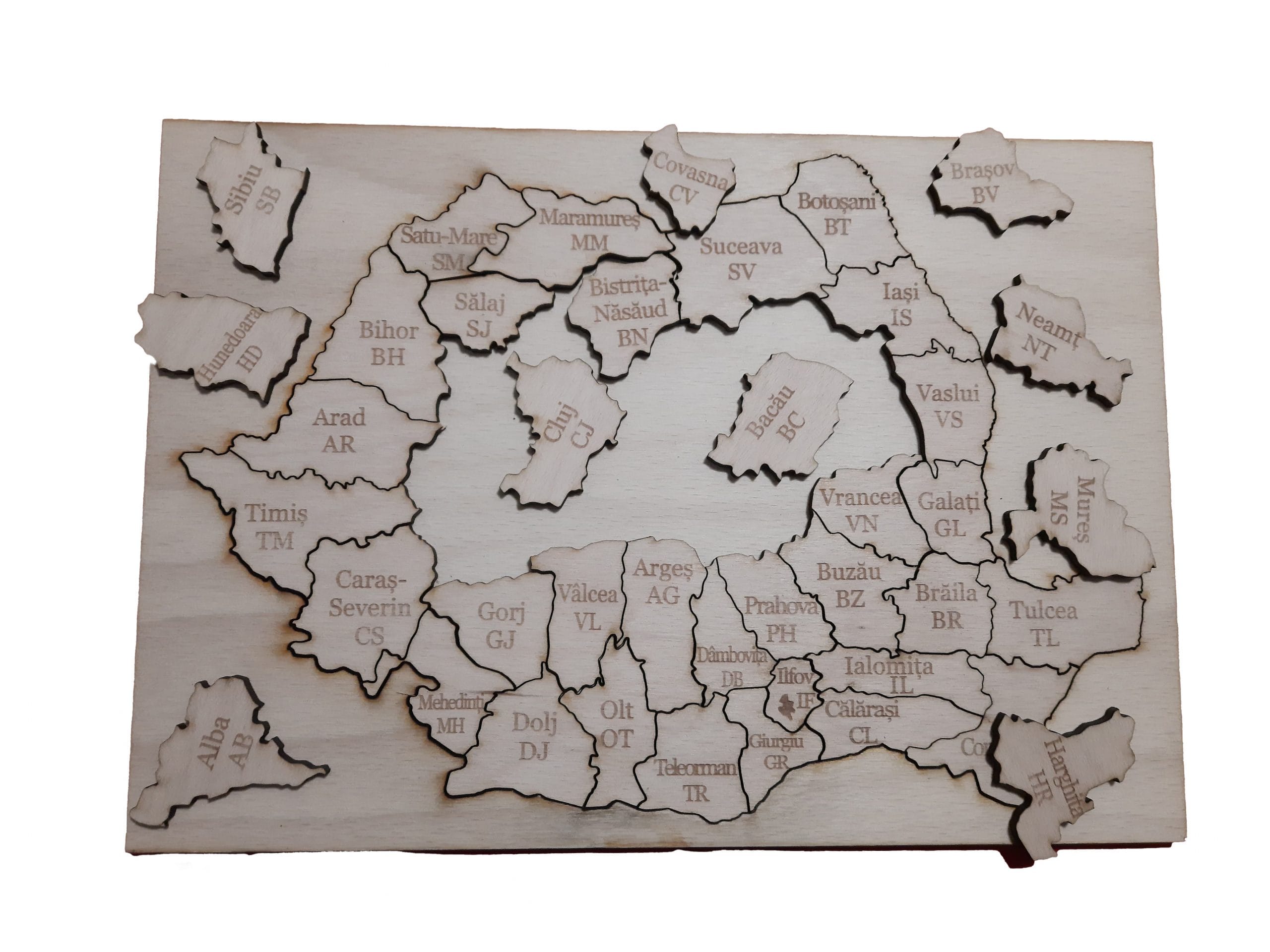 Puzzle sub forma de harta Romaniei, din lemn, in format A4.