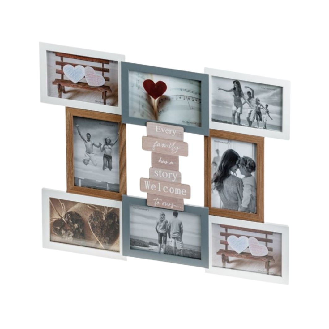 Rama foto decorativa pentru 8 poze cu rama de stejar de diferite culori si mesaj „Fiecare familie are o poveste, bun venit in a noastra”.