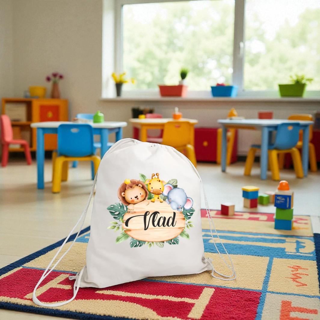 Rucsacul copii personalizat Animale, Jungla este ideal pentru grădiniță, excursii și activitățile zilnice. Alege designul preferat, adaugă numele copilului și bucură-te de un produs unic, realizat cu drag în atelierul Ideal Moments!
