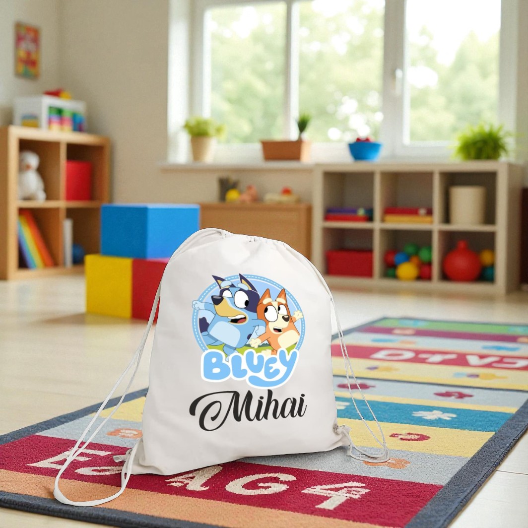 Rucsacul copii personalizat Bluey, Catelusi este ideal pentru grădiniță, excursii și activitățile zilnice. Alege designul preferat, adaugă numele copilului și bucură-te de un produs unic, realizat cu drag în atelierul Ideal Moments!