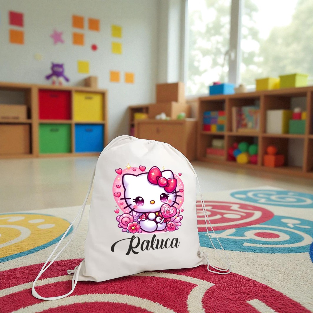 Rucsacul copii personalizat Hello Kitty, Roz este ideal pentru grădiniță, excursii și activitățile zilnice. Alege designul preferat, adaugă numele copilului și bucură-te de un produs unic, realizat cu drag în atelierul Ideal Moments!