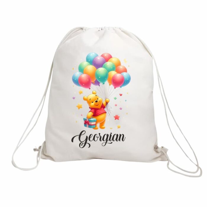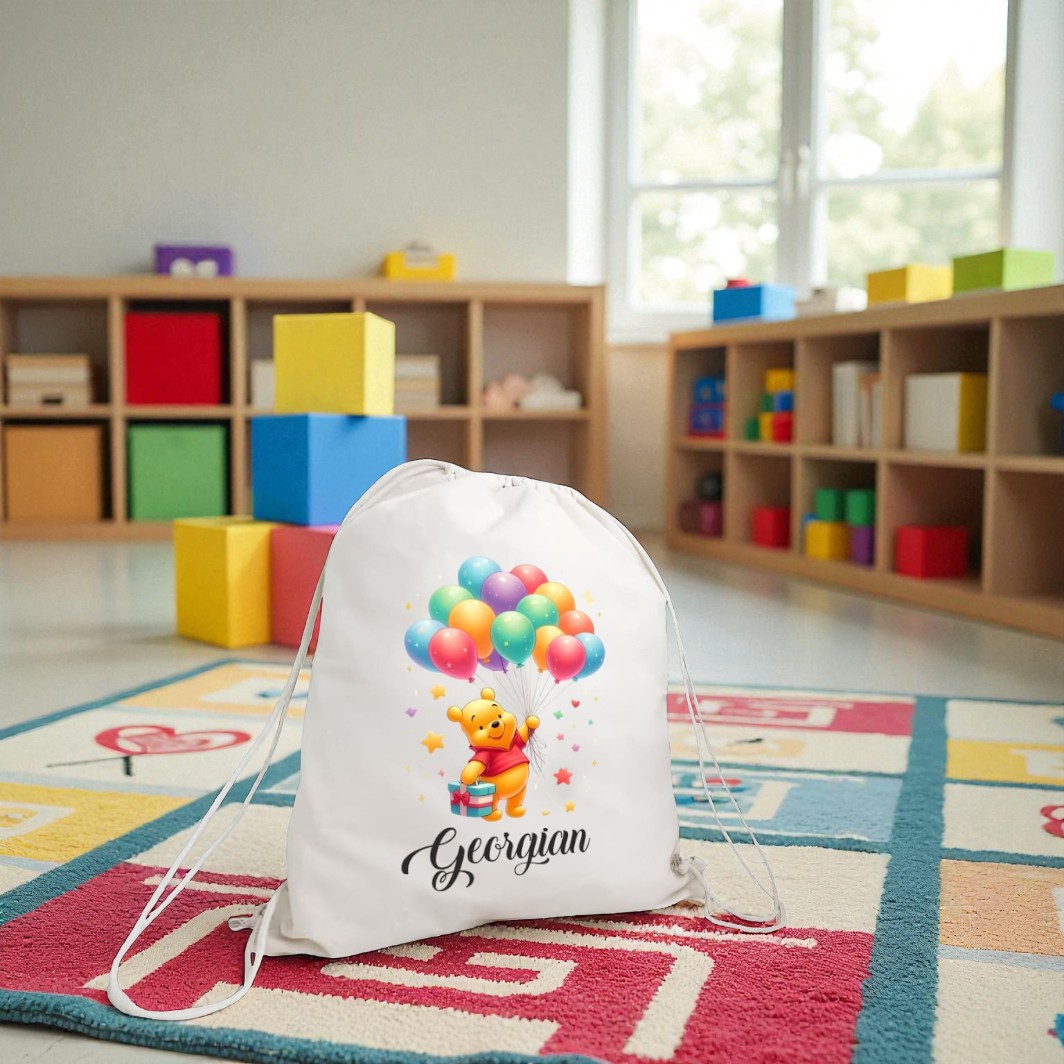Rucsacul copii personalizat Winnie Pooh Baloane este ideal pentru grădiniță, excursii și activitățile zilnice. Alege designul preferat, adaugă numele copilului și bucură-te de un produs unic, realizat cu drag în atelierul Ideal Moments!