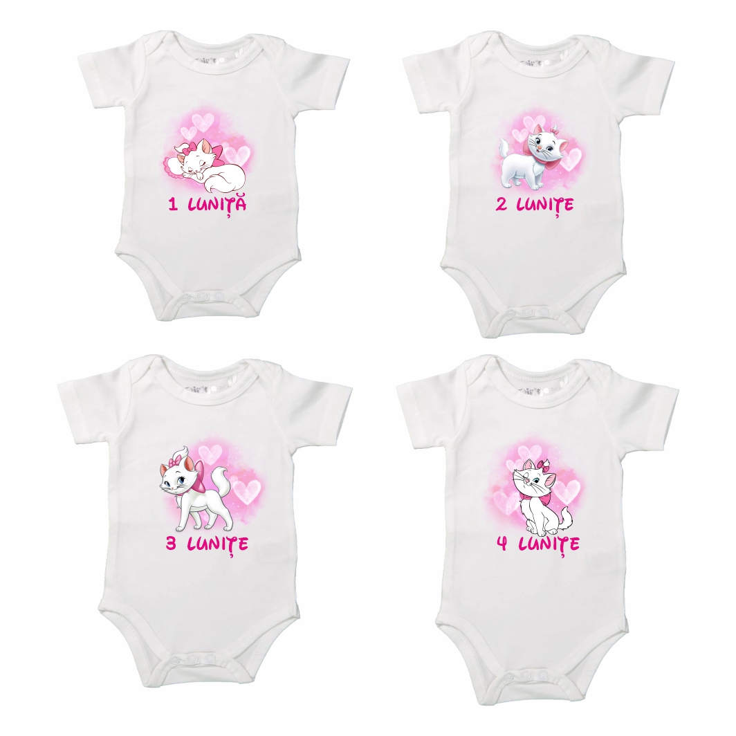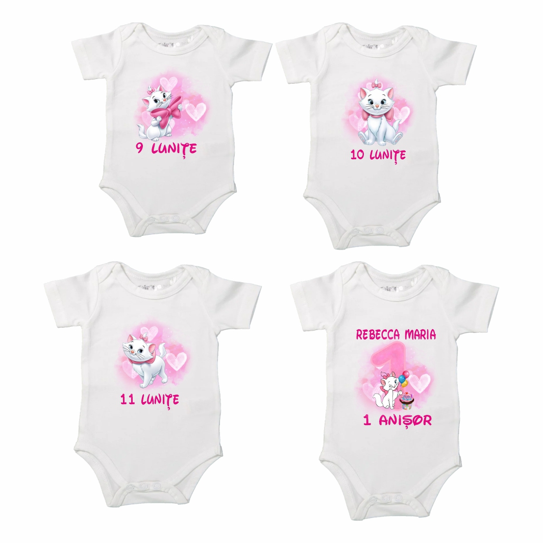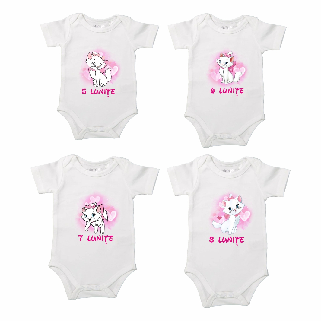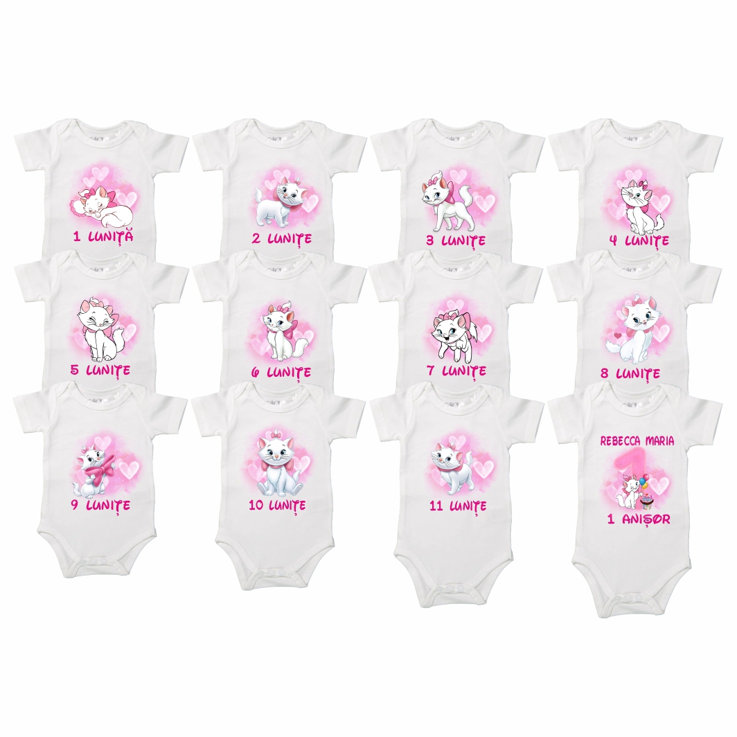 Set 12 body-uri cu lunile bebelusului, Pisica Marrie, Bumbac, Alb, BSA005