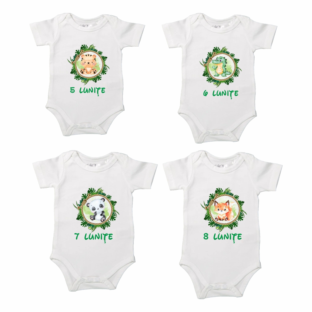 Set 12 body-uri cu lunile bebelusului, Safari, Bumbac, Alb, BSA004