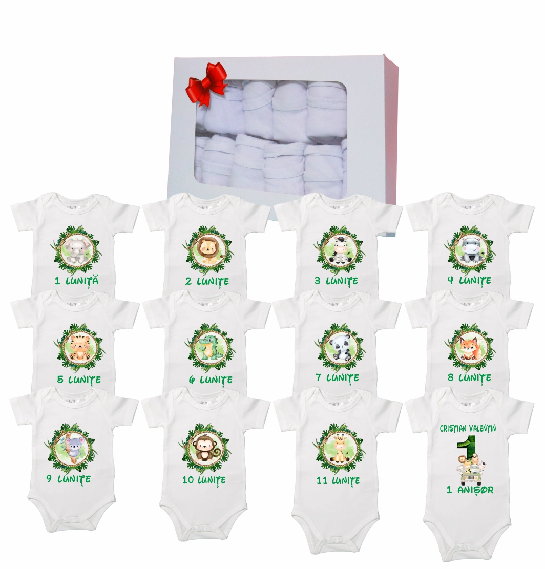 Va recomandam setul de 12 body-uri din bumbac 100%, cate unul pentru fiecare luna.