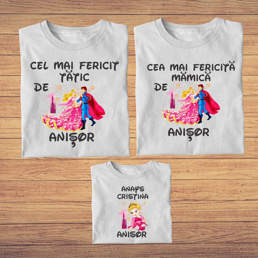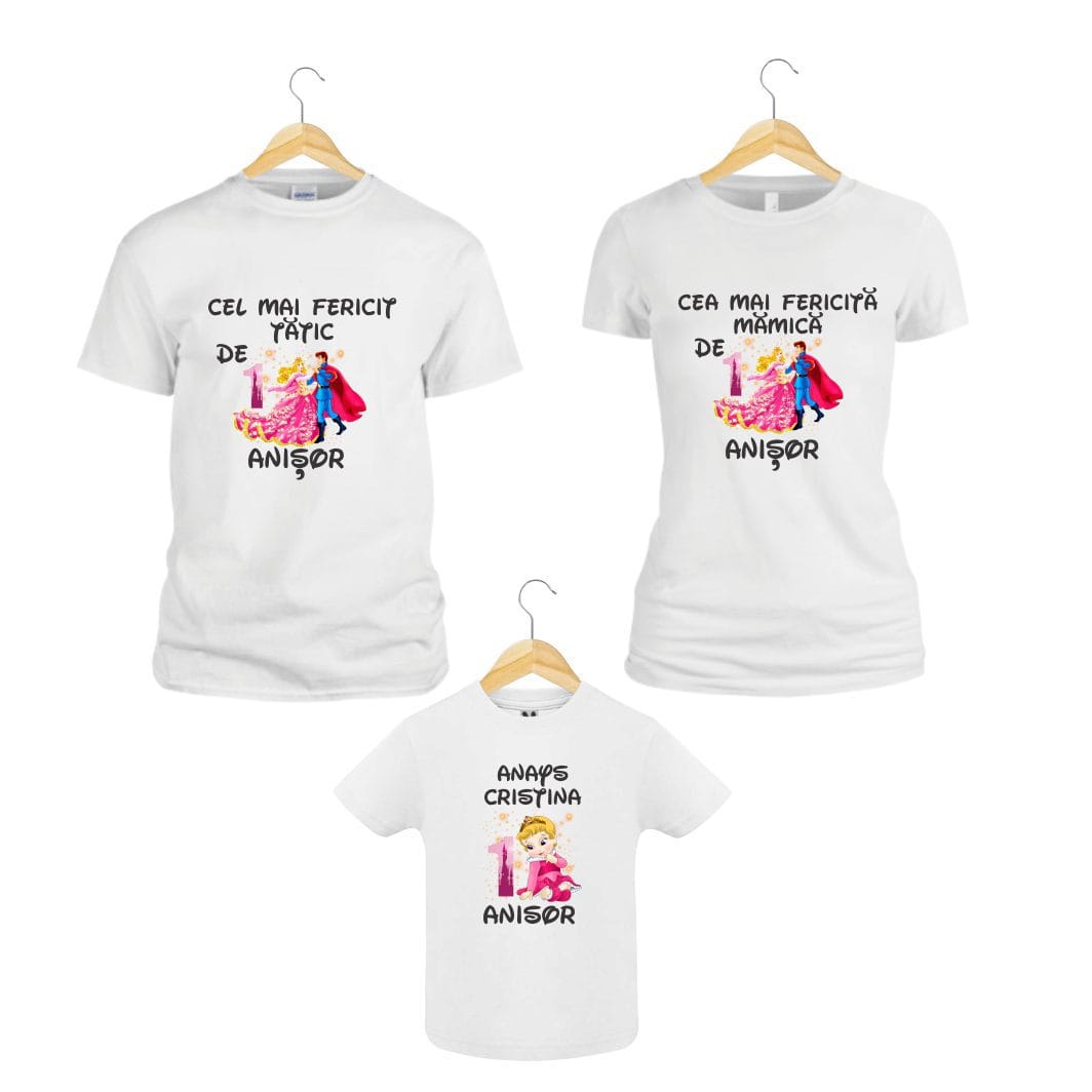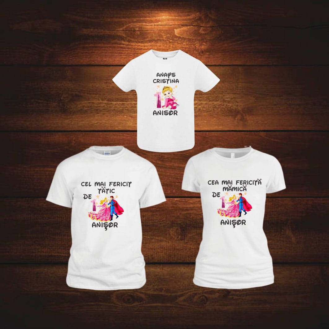 Set 3 tricouri pentru aniversarea de 1 an, taiere mot, Frumoasa Adormita, Bumbac, Alb, TM22