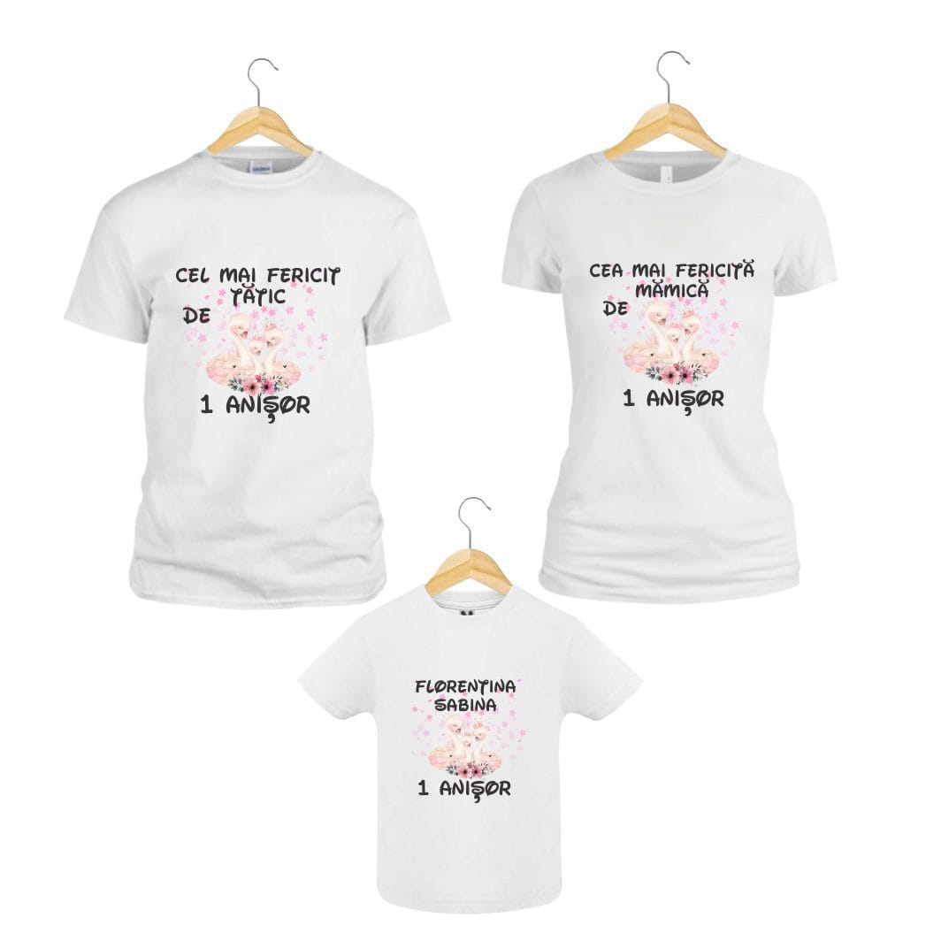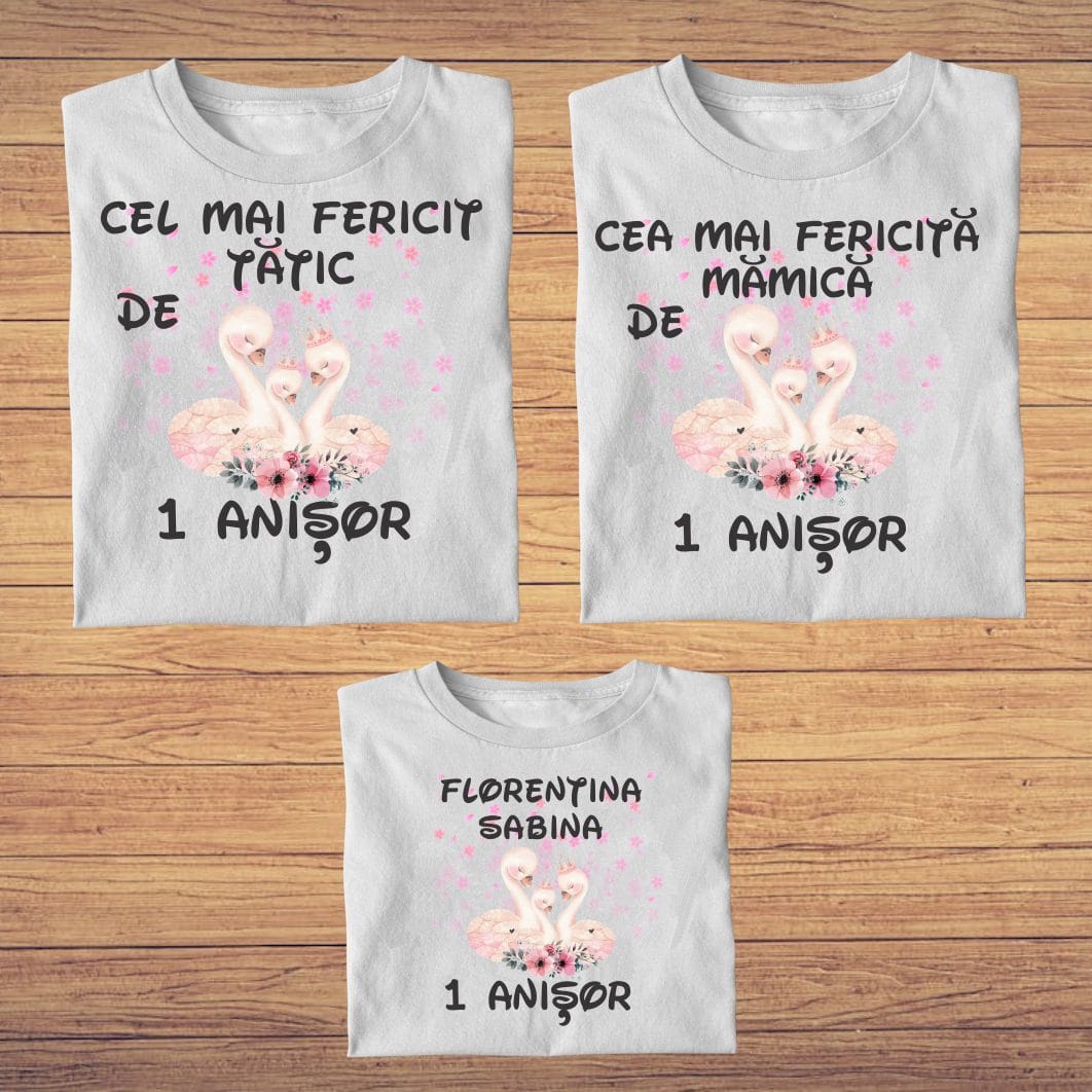 Set 3 tricouri pentru aniversarea de 1 an, taiere mot, Lebede, Bumbac, Alb, TM41