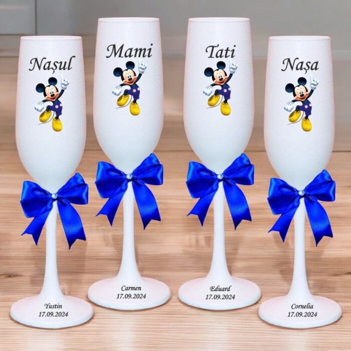 Setul de pahare personalizate Mickey este o alegere inspirată pentru a celebra primul eveniment important din viața copilului. Paharele pot fi folosite atât în timpul petrecerii, cât și ulterior, ca amintire de suflet pentru familie și nași. Combinația dintre albul pur, fundița colorată și printul de poveste creează un ansamblu armonios, potrivit atât pentru fetițe, cât și pentru tematici de botez elegante.