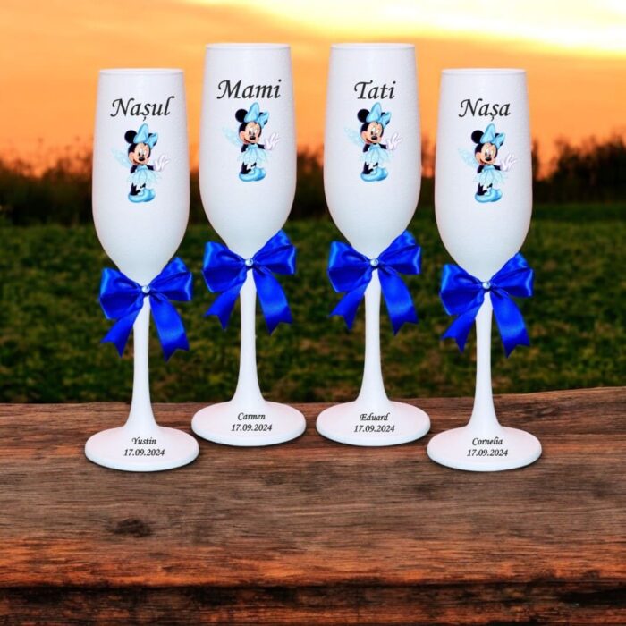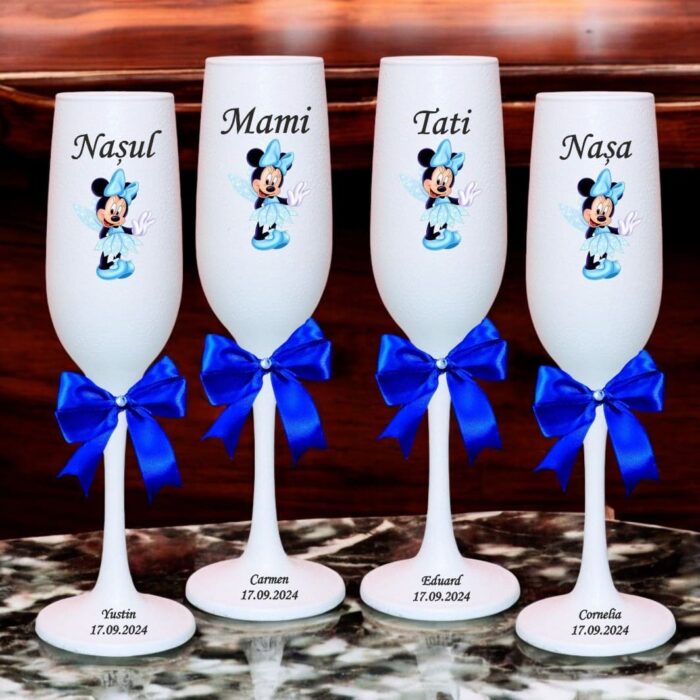 Setul 4 Pahare Botez Personalizate, Minnie, Albastra, Alb, PHB006 combină frumusețea poveștilor clasice cu eleganța sticlei personalizate. Este un accesoriu esențial pentru orice botez tematic și un simbol al momentelor pline de emoție și bucurie. Cu o întreținere simplă și un design care atrage privirile, acest set de pahare este alegerea ideală pentru părinții și nașii care iubesc detaliile rafinate și amintirile de durată.