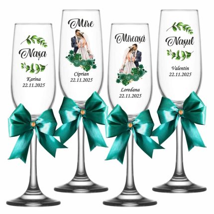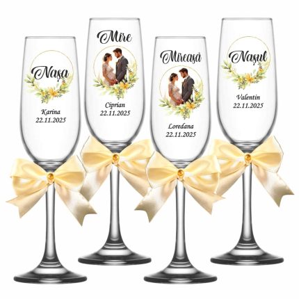 Setul este alcatuit din 4 pahare de sampanie albe, decorate cu siluete si personalizate cu numele mirilor/ nasilor si data evenimentului.
