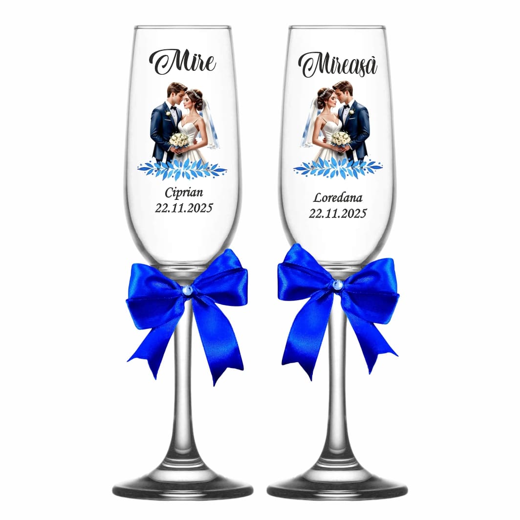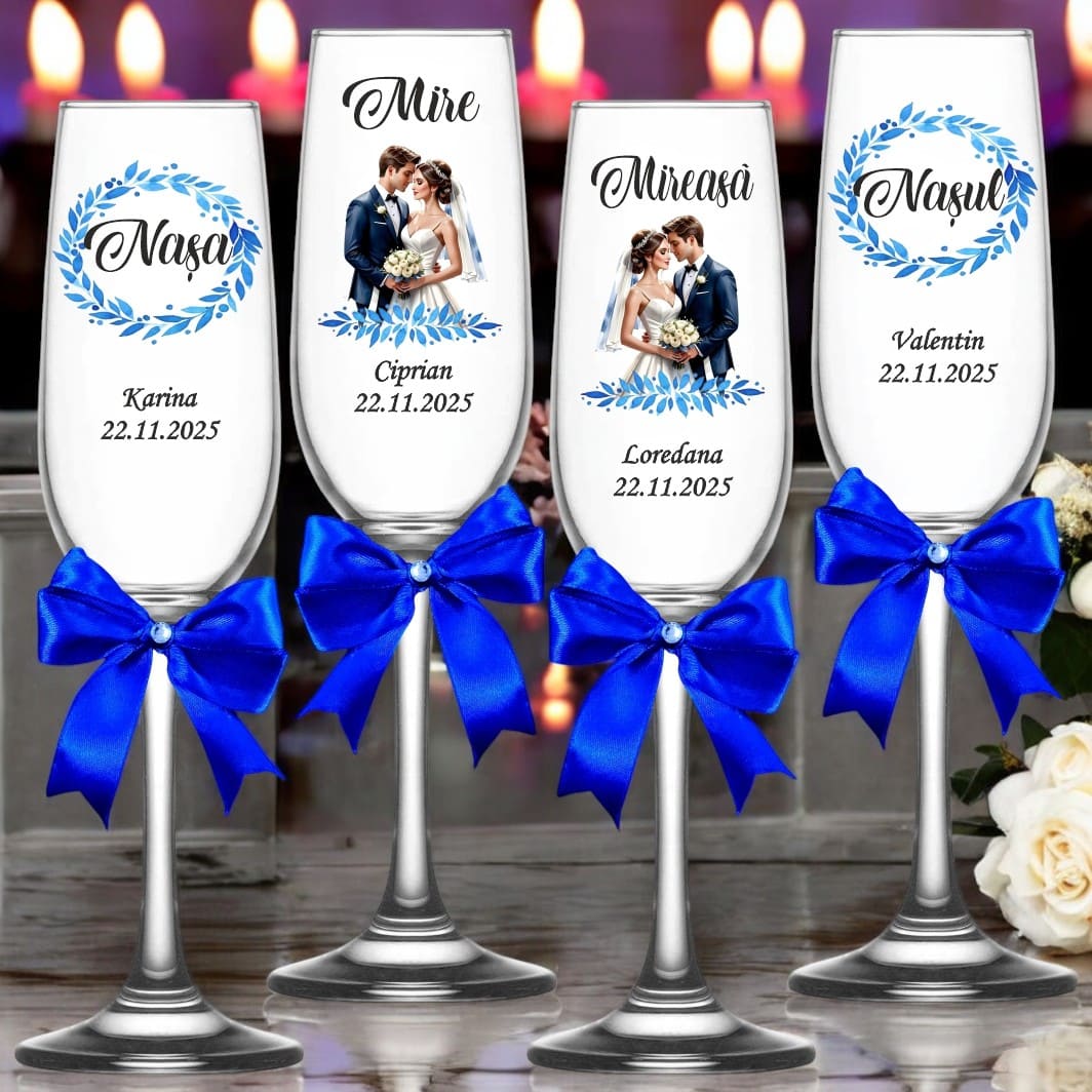 Set 4 Pahare Personalizate, Nunta, Miri, Nasi, Albastru, PNBT009