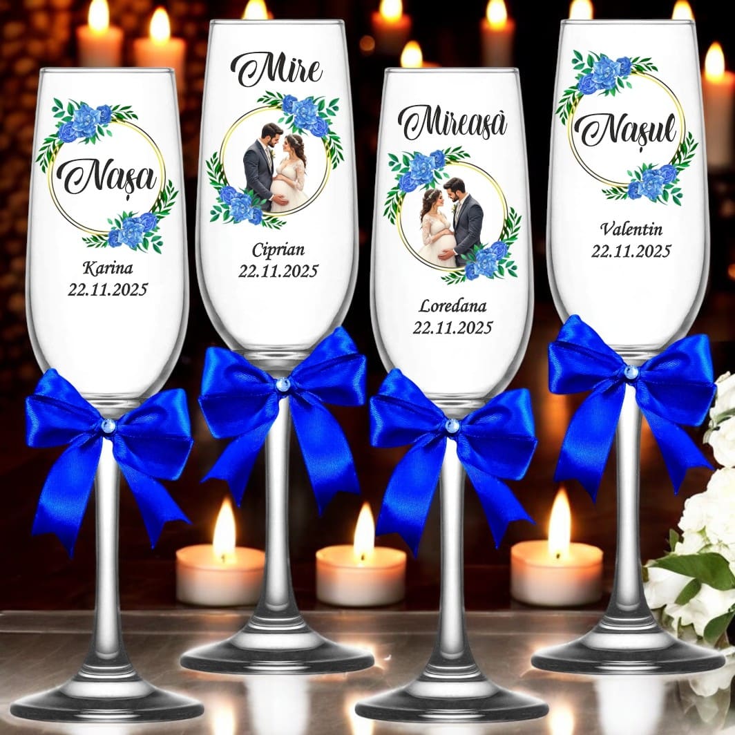 Set 4 Pahare Personalizate, Nunta, Miri, Nasi, Albastru, PNBT016