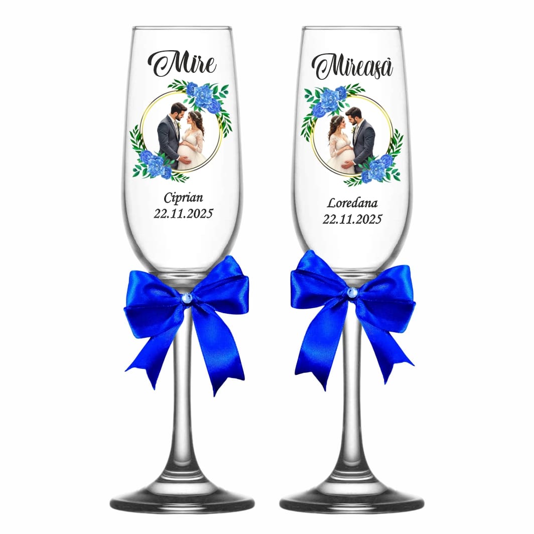 Realizate din sticlă transparentă de calitate superioară, fiecare pahar este personalizat cu numele mirilor, al nașilor și data evenimentului, adăugând o notă unică și emoționantă fiecărei petreceri.