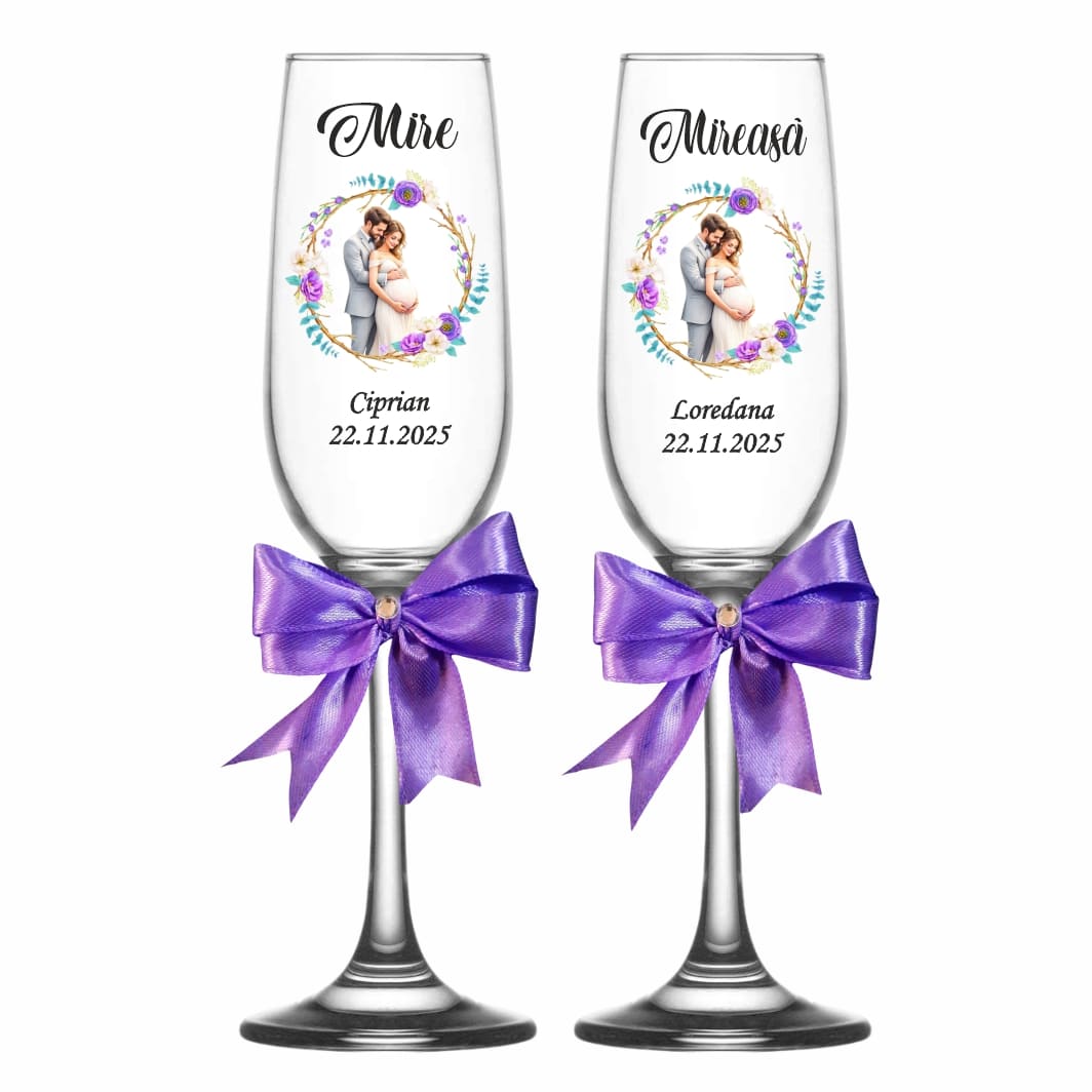 Realizate din sticlă transparentă de calitate superioară, fiecare pahar este personalizat cu numele mirilor, al nașilor și data evenimentului, adăugând o notă unică și emoționantă fiecărei petreceri.