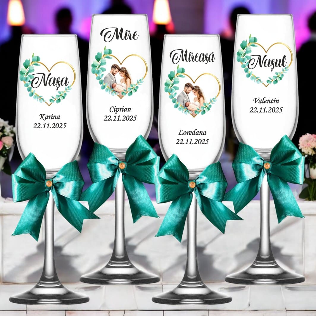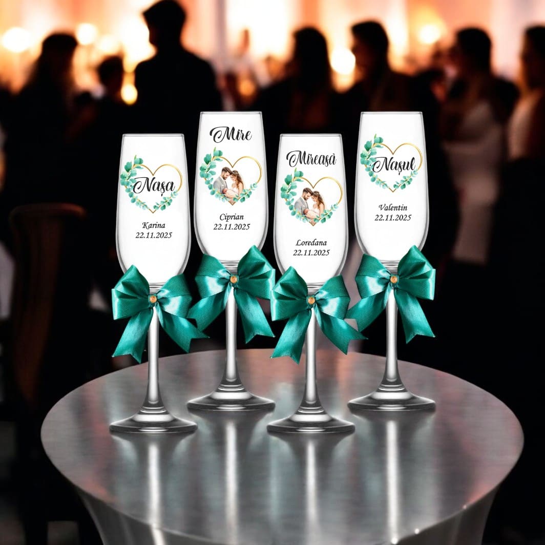 Transformă momentul toastului într-o amintire de neuitat cu acest set exclusiv de 4 pahare de șampanie, special create pentru miri și nași.