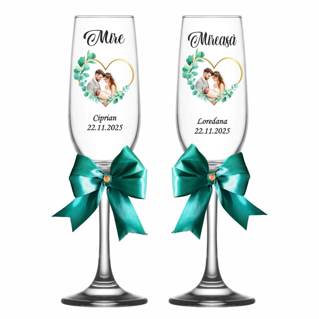 Realizate din sticlă transparentă de calitate superioară, fiecare pahar este personalizat cu numele mirilor, al nașilor și data evenimentului, adăugând o notă unică și emoționantă fiecărei petreceri.