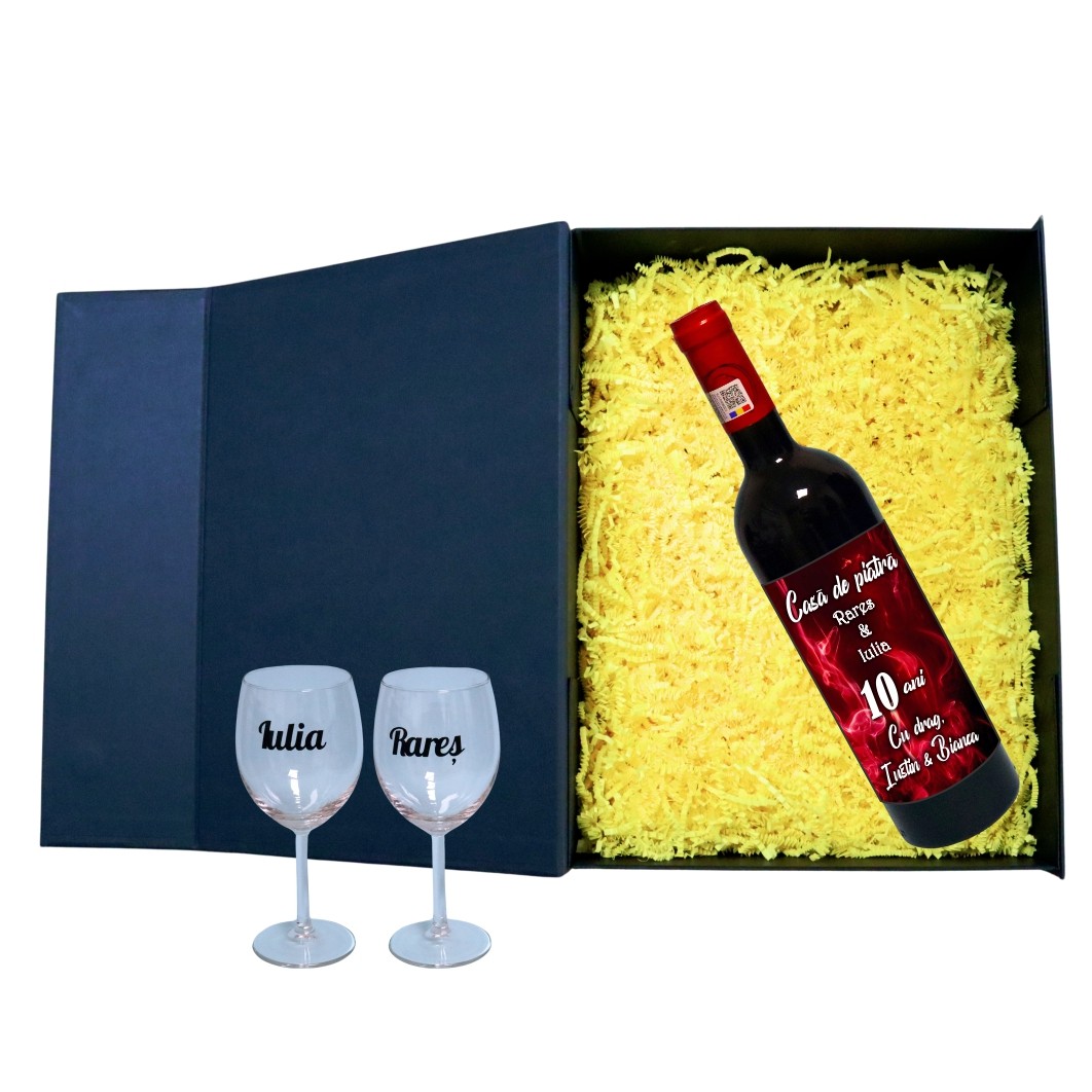 Set cadou aniversar, Cutie de vin cu sticla si 2 pahare, 35x25cm, Vin Domeniile Panciu Feteasca Neagra, CSVA001