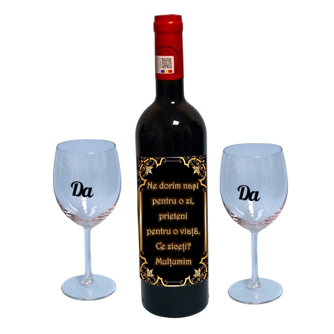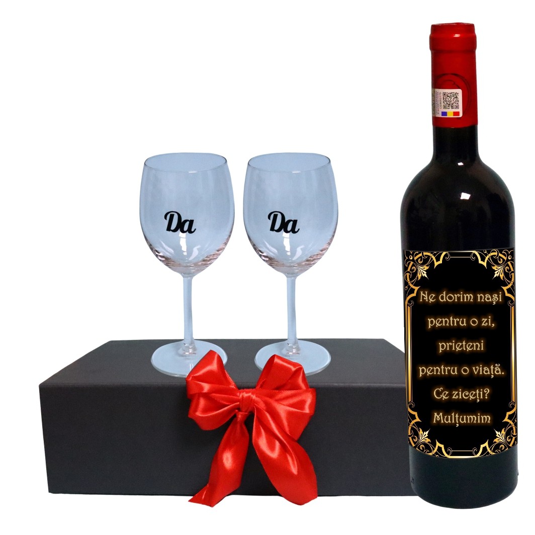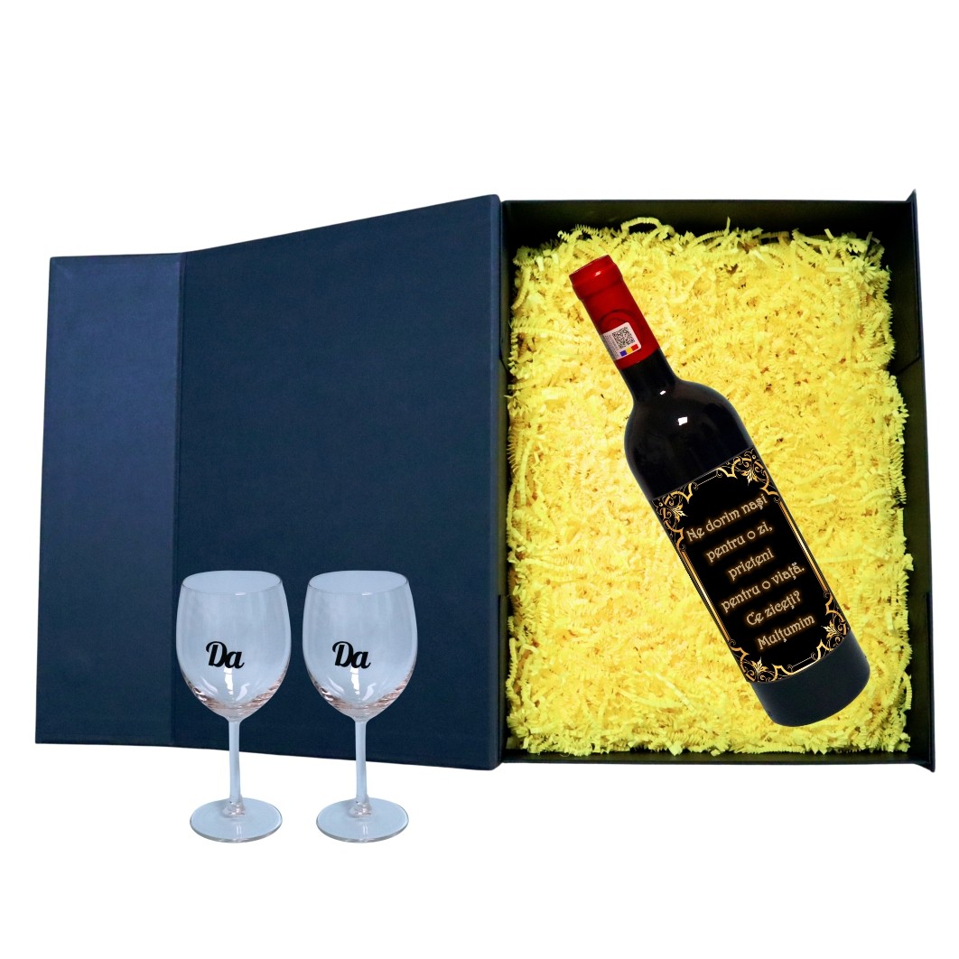 Set cadou Cerere nasi, Cutie de vin cu sticla si 2 pahare, 35x25cm, Vin Domeniile Panciu Feteasca Neagra, CSVCN007 Prețul inițial a fost: 250,00 lei.Prețul curent este: 235,90 lei.