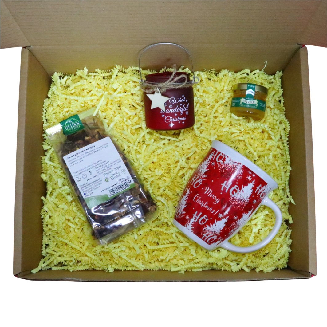 Set cadou Craciun 4 piese, Ceai, Candela, Cana, Miere, 32,5×25,5×10,5 cm, SCC003