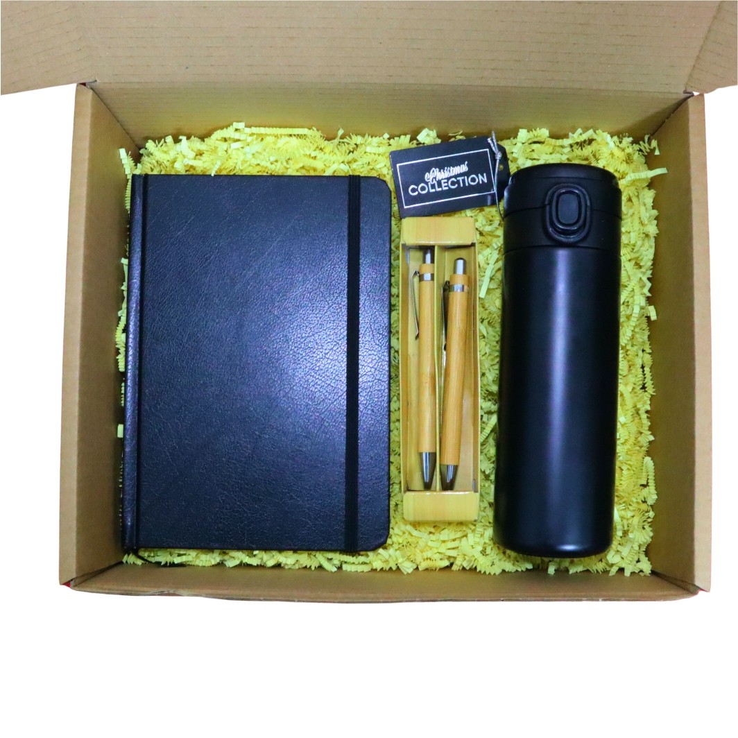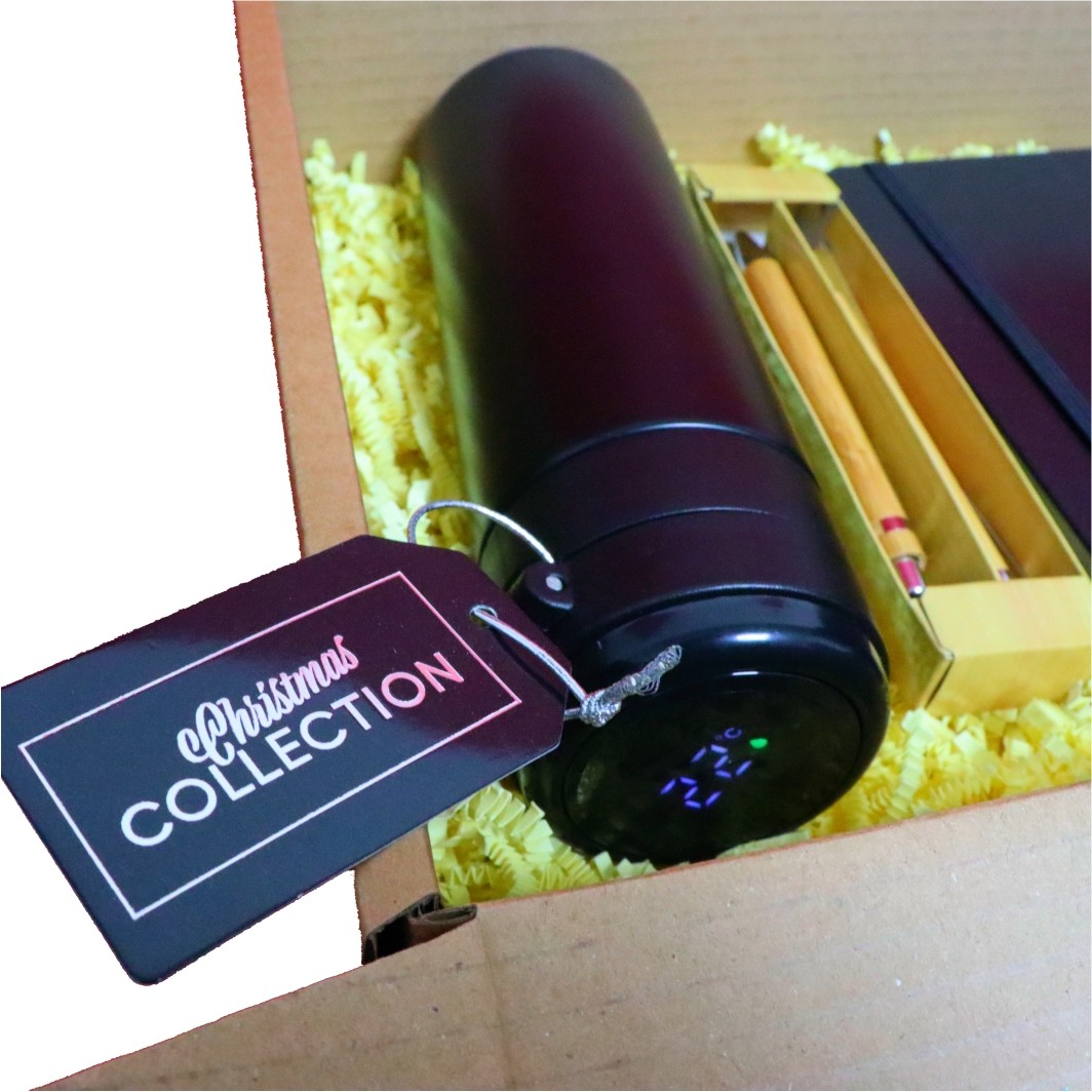 Set cadou Craciun 4 piese, Termos negru smart, Pix si Creion, Carnet elegant, 32,5×25,5×10,5 cm, SCC015