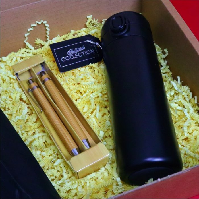 Set cadou Craciun 4 piese, Umbrela eleganta neagra, Pix si Creion, Termos smart, 32,5×25,5×10,5 cm, SCC004