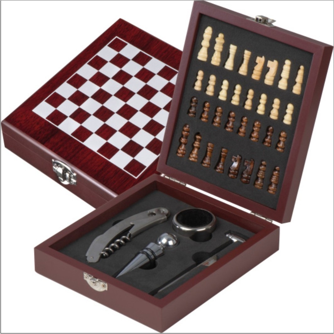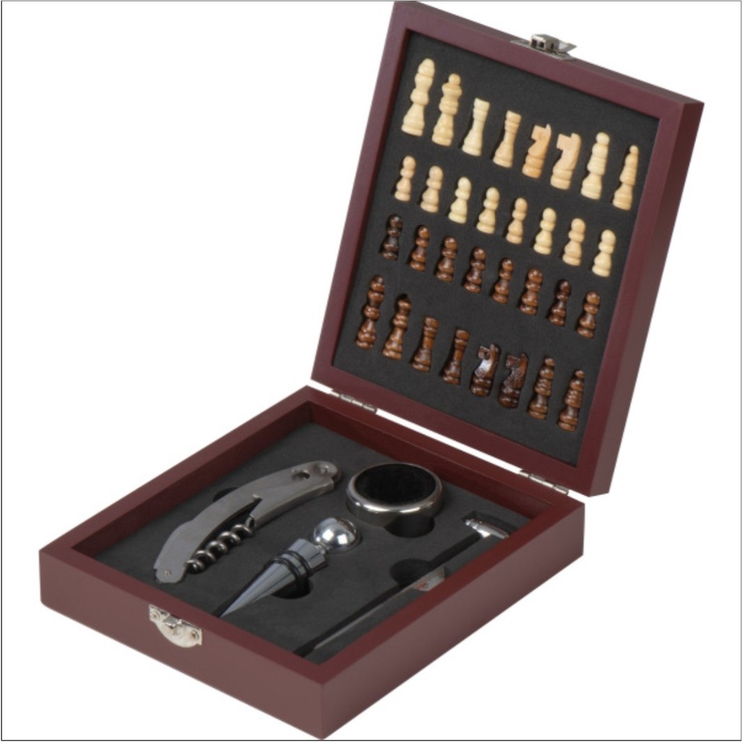 Set cadou cu 4 accesorii pentru vin si joc sah, Lemn, 17,5x15x4,7 cm, SCB005