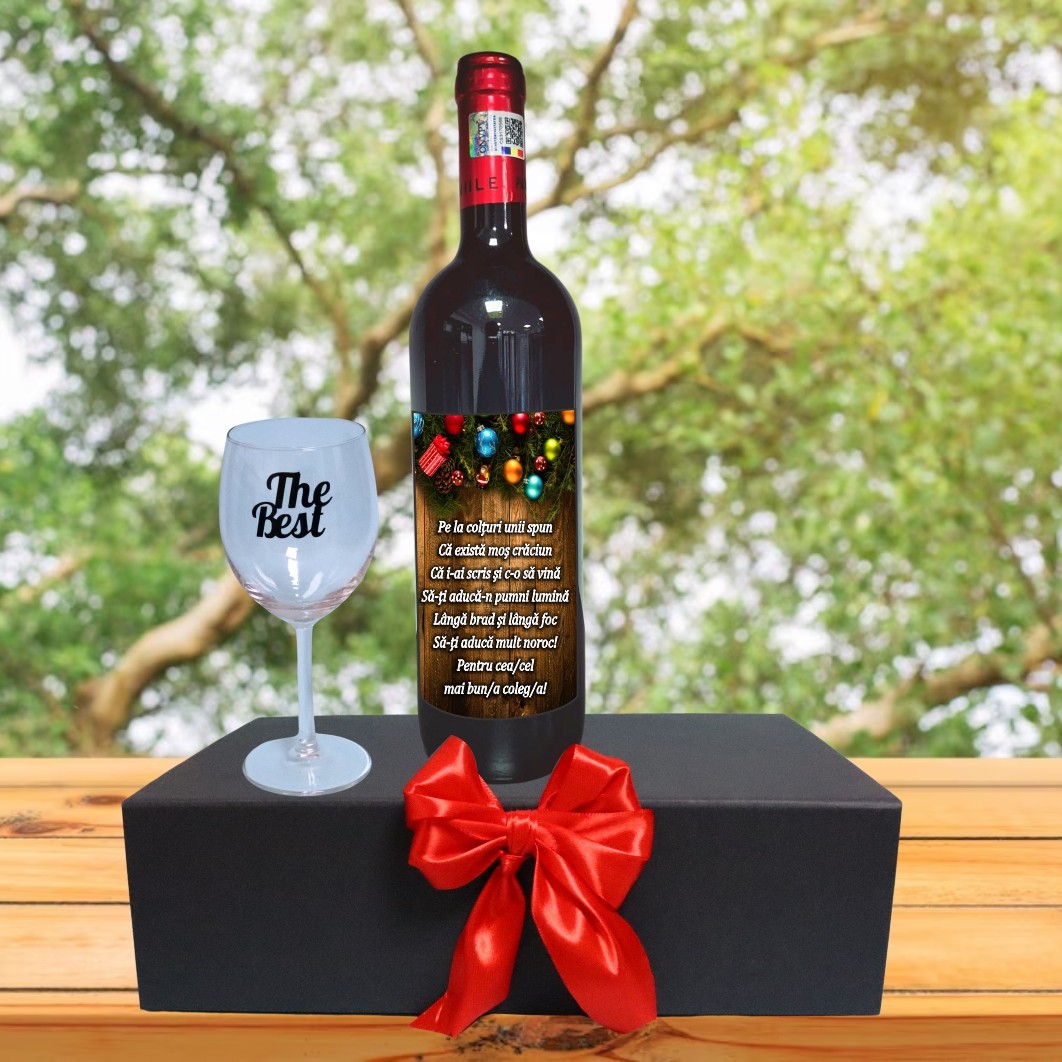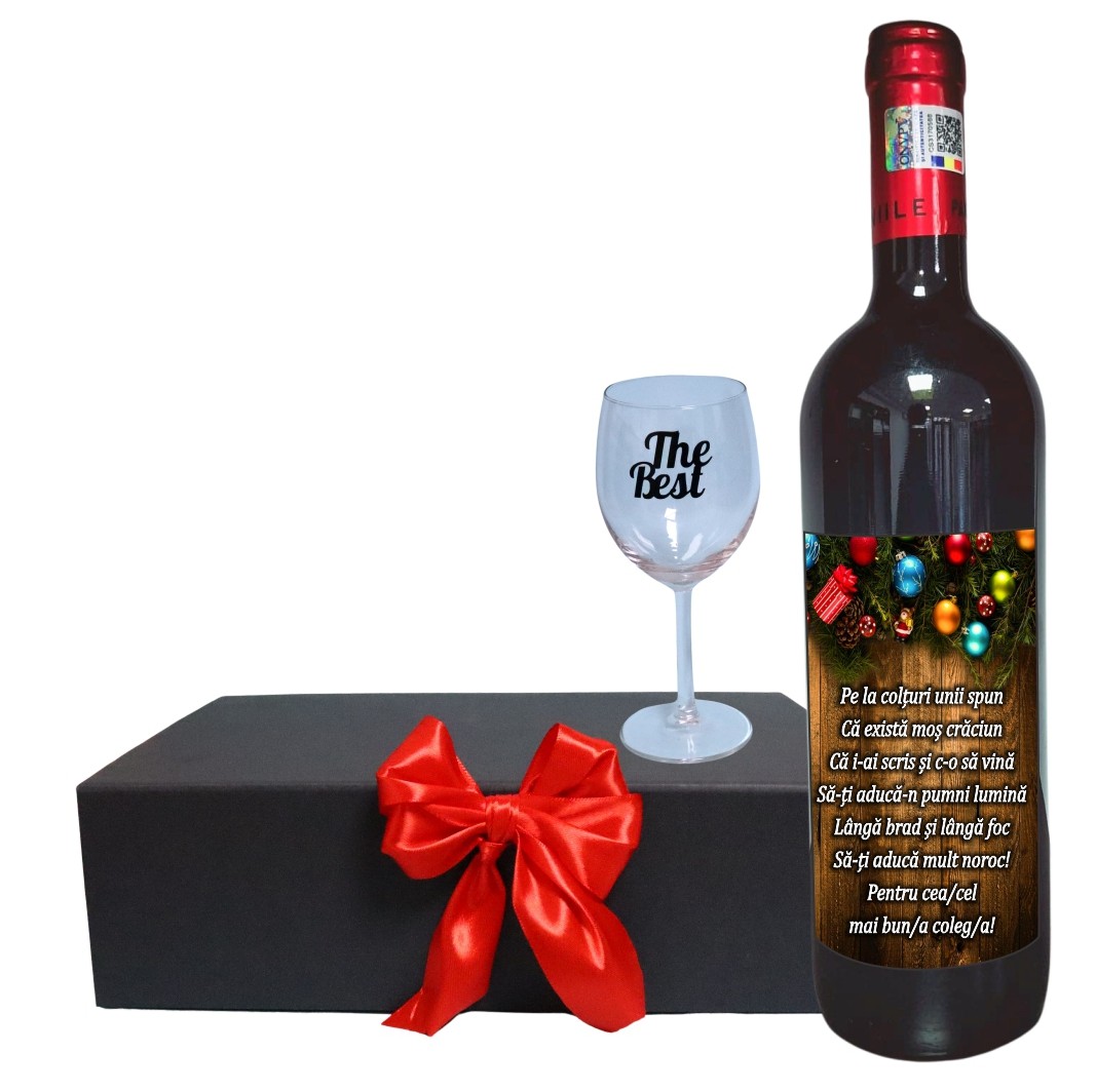 Set cadou de Sarbatori pentru coleg/a, Cutie de vin cu sticla si un pahar, 35x25cm, Vin Domeniile Panciu Feteasca Neagra, CSVC001