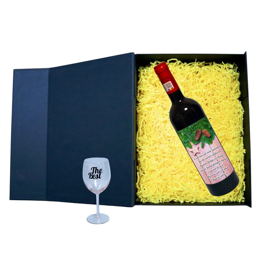 Set cadou de Sarbatori pentru coleg/a, Cutie de vin cu sticla si un pahar, 35x25cm, Vin Budureasca Clasic, CSVC008