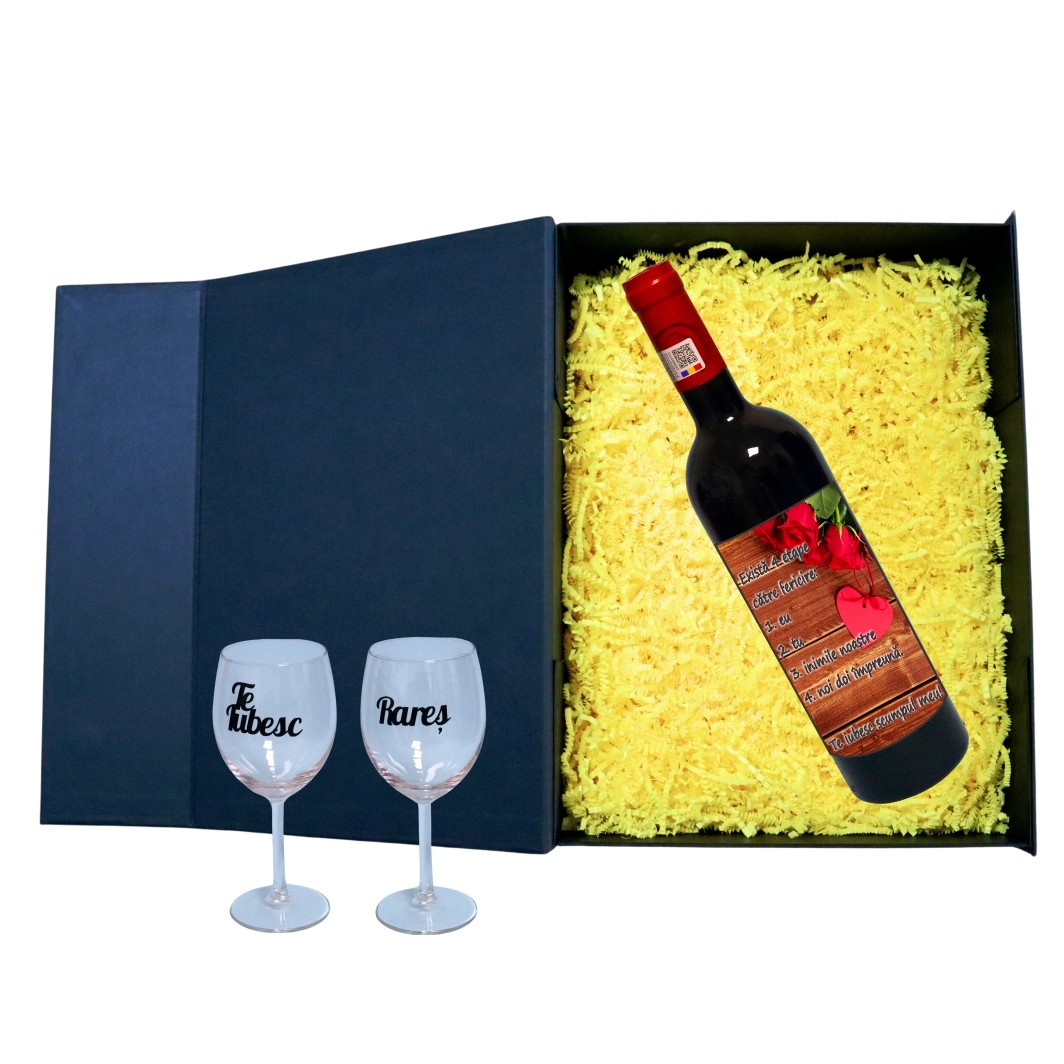 Set cadou Iubit/Sot, Cutie de vin cu sticla si 2 pahare, 35x25cm, Vin Domeniile Panciu Feteasca Neagra, CSVIS007