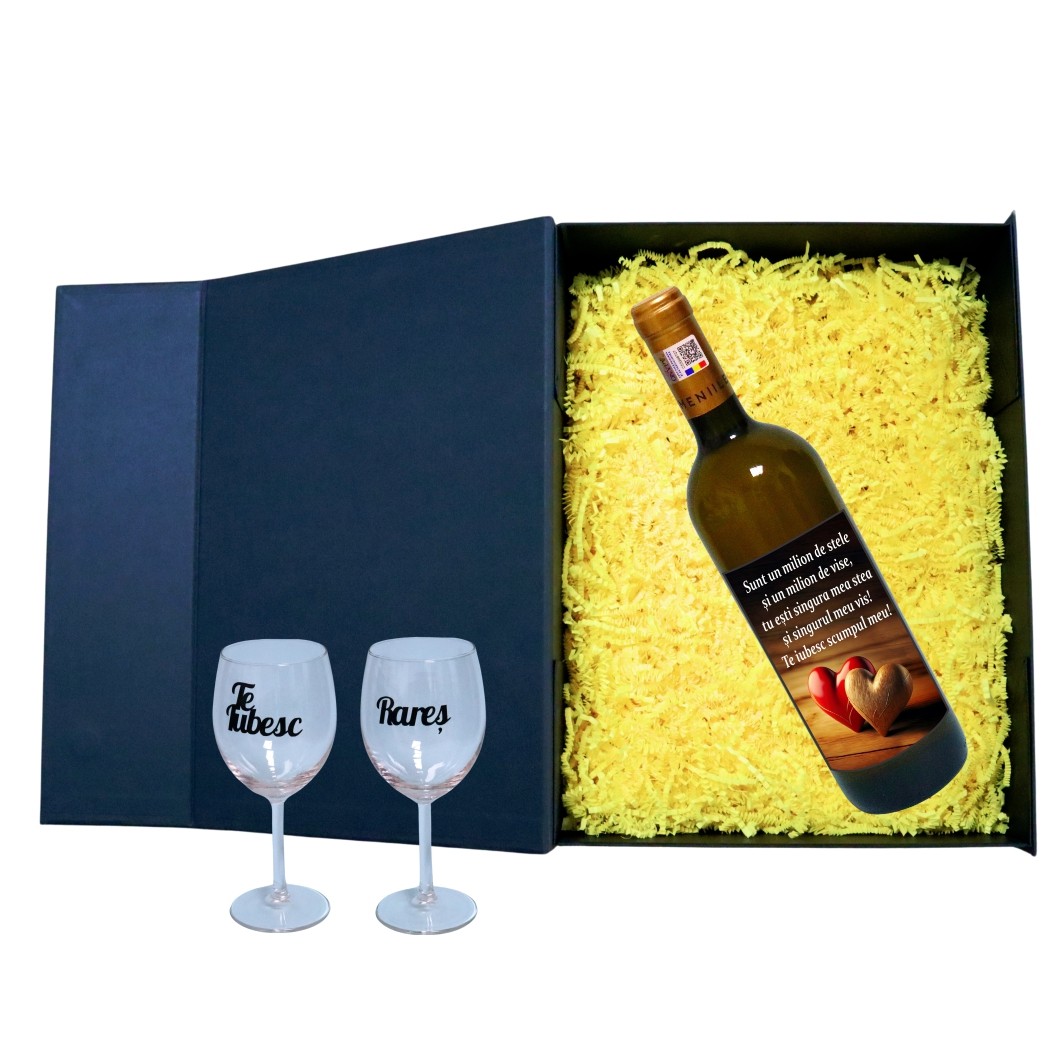 Set cadou Iubit/Sot, Cutie de vin cu sticla si 2 pahare, 35x25cm, Vin Domeniile Panciu Feteasca Regala, CSVIS012