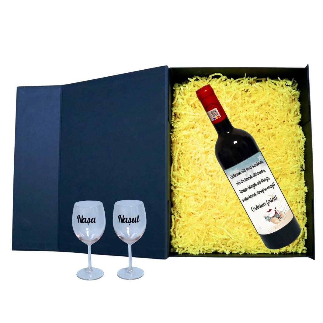 Set cadou Nasi, Cutie de vin cu sticla si 2 pahare, 35x25cm, Vin Budureasca Clasic, CSVN027