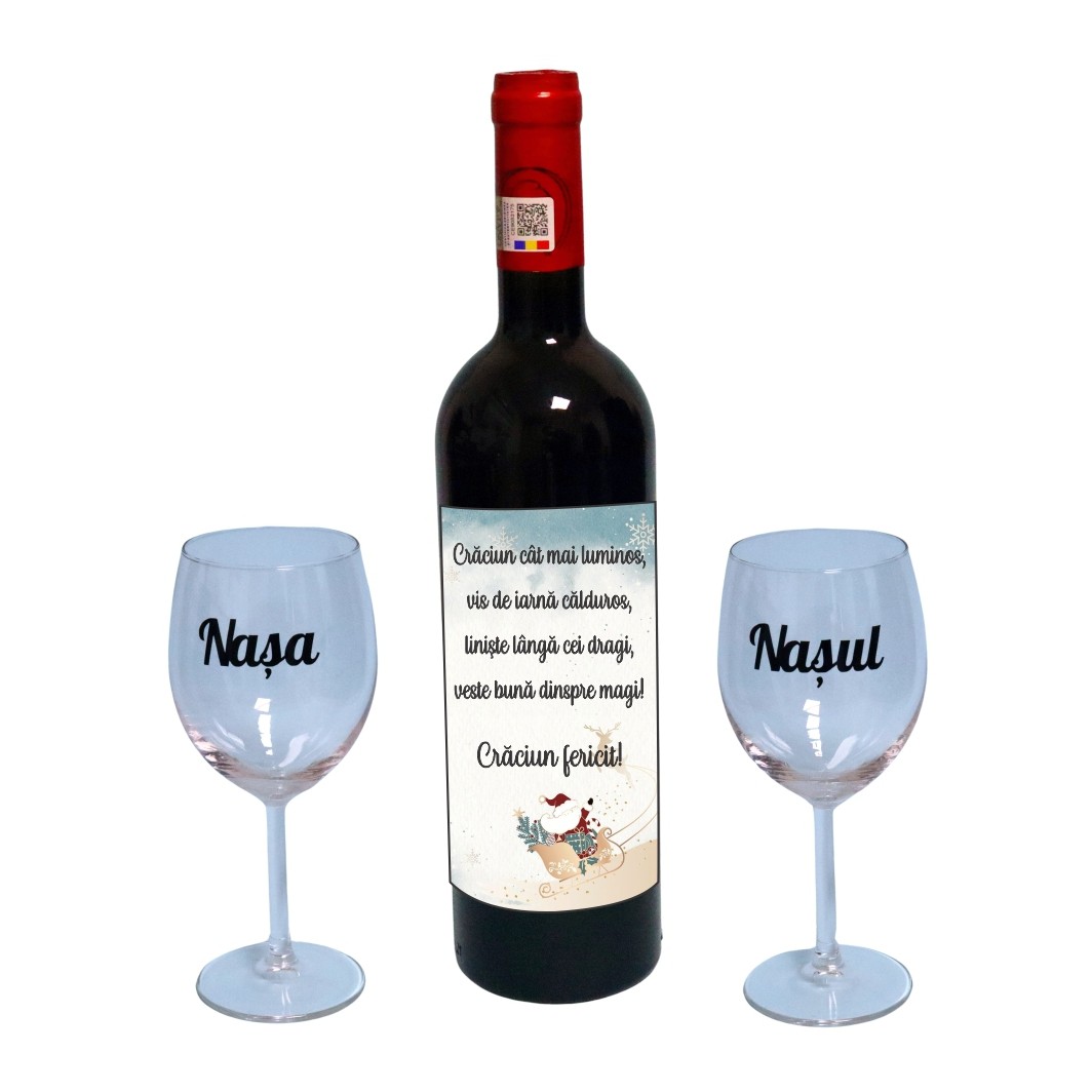 Set cadou Nasi, Cutie de vin cu sticla si 2 pahare, 35x25cm, Vin Domeniile Panciu Feteasca Regala, CSVN028