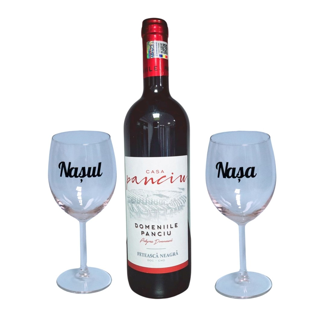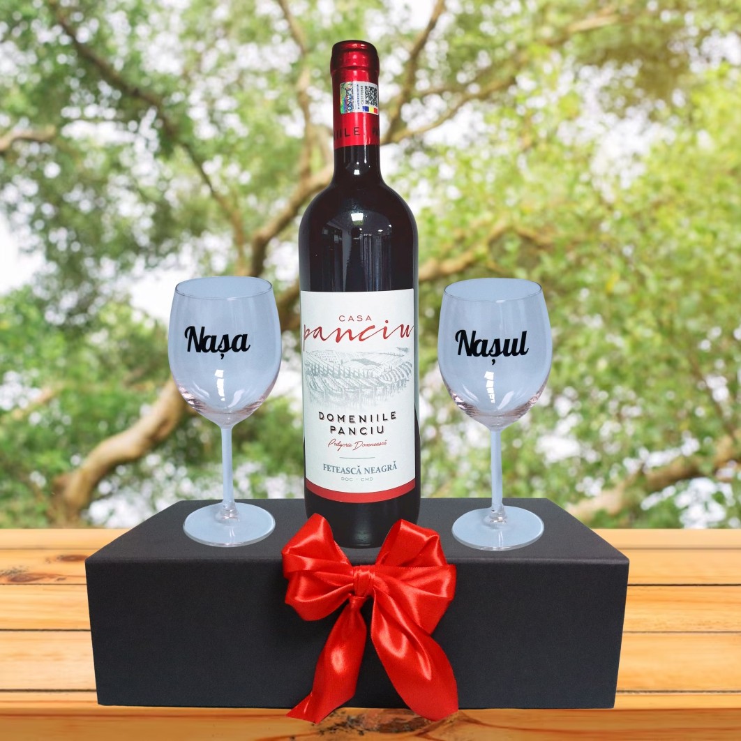 Set cadou Nasi, Cutie de vin cu sticla si 2 pahare, 35x25cm, Vin Domeniile Panciu Feteasca Neagra, CSVN010